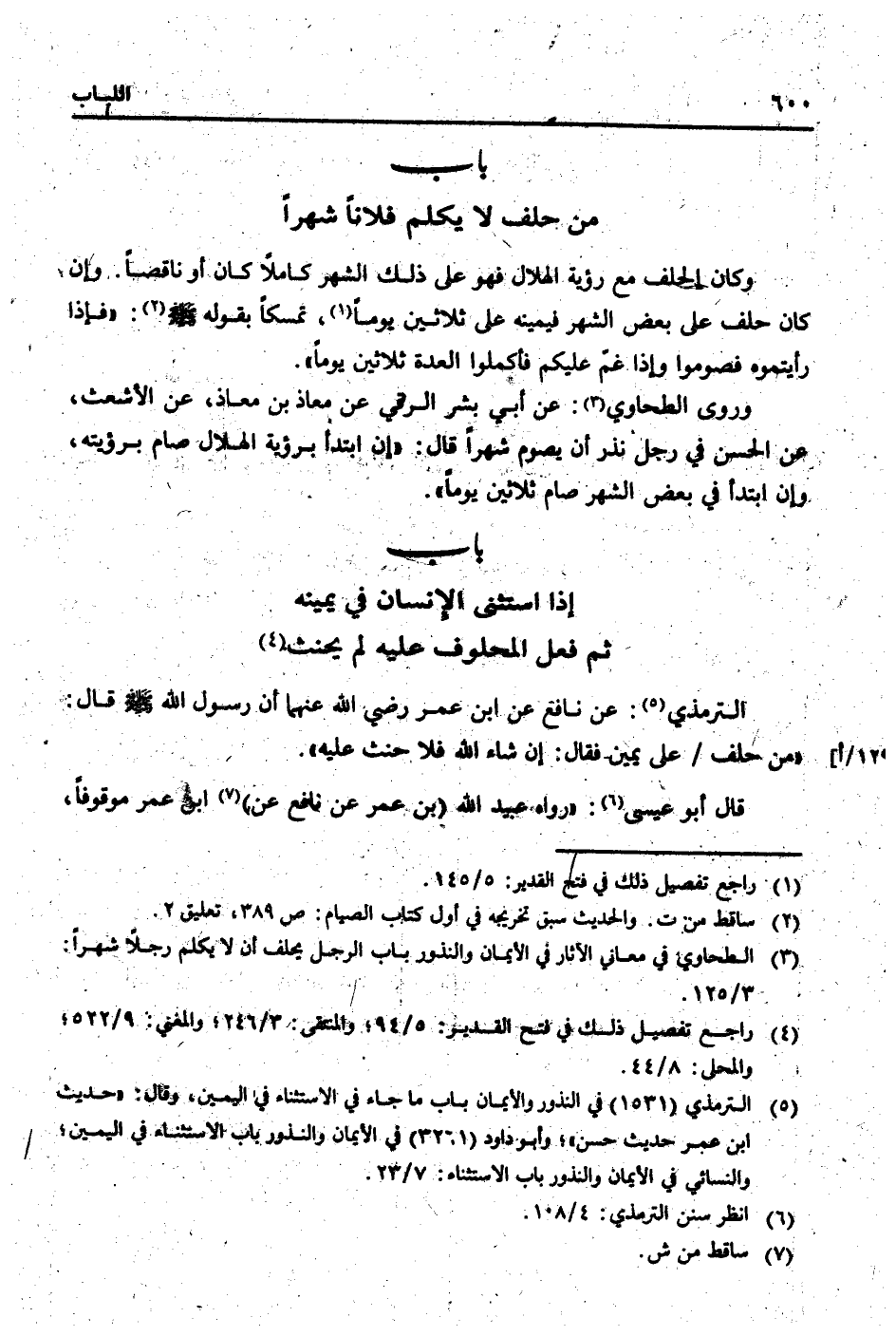 التِّرْمِذِيّ: عَن نَافِع عَن ابْن عمر رَضِي الله عَنْهُمَا أَن رَسُول الله [صلى الله عَلَيْهِ وَسلم] قَالَ: " من حلف / على يَمِين فَقَالَ: إِن شَاءَ الله فَلَا حنث عَلَيْهِ ".