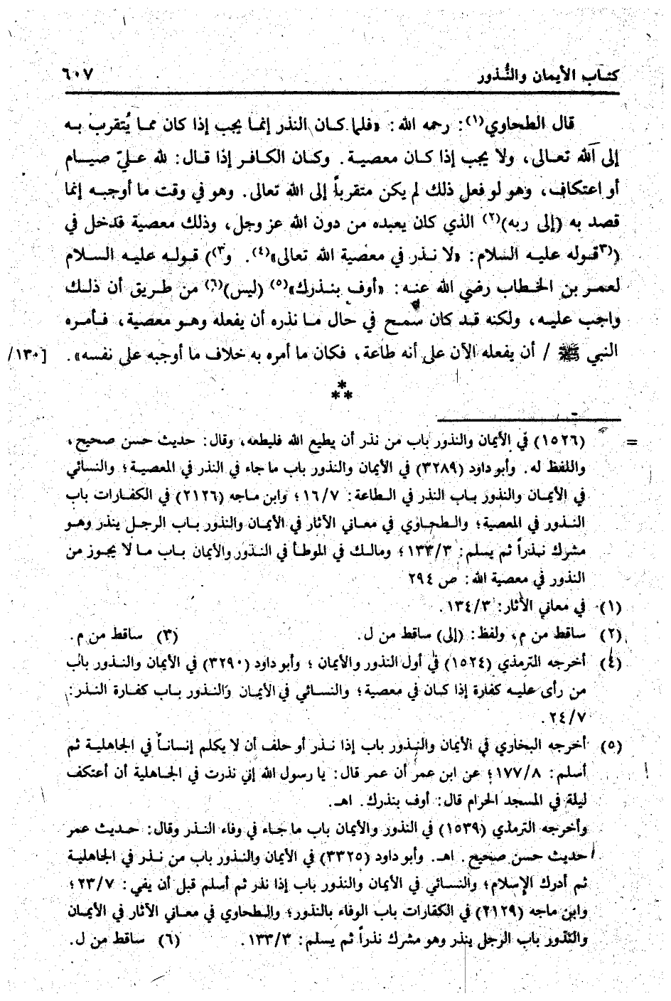 قَالَ الطَّحَاوِيّ: رَحمَه الله: " فَلَمَّا كَانَ النّذر إِنَّمَا يجب إِذا كَانَ مِمَّا يتَقرَّب بِهِ إِلَى الله تَعَالَى، وَلَا يجب إِذا كَانَ مَعْصِيّة. وَكَانَ الْكَافِر إِذا قَالَ: لله عَليّ صِيَام أَو اعْتِكَاف، وَهُوَ لَو فعل ذَلِك لم يكن متقربا إِلَى الله تَعَالَى. وَهُوَ فِي وَقت مَا أوجبه إِنَّمَا قصد بِهِ (إِلَى ربه) الَّذِي كَانَ يعبده من دون الله عز وَجل، وَذَلِكَ مَعْصِيّة فَدخل فِي (قَوْله عَلَيْهِ السَّلَام: " لَا نذر فِي مَعْصِيّة الله تَعَالَى ". و) قَوْله عَلَيْهِ السَّلَام لعمر بن الْخطاب رَضِي الله عَنهُ: " أوف بِنَذْرِك " (لَيْسَ) من طَرِيق أَن ذَلِك وَاجِب عَلَيْهِ، وَلكنه قد كَانَ سمح فِي حَال مَا نَذره أَن يَفْعَله وَهُوَ مَعْصِيّة، فَأمره النَّبِي [صلى الله عَلَيْهِ وَسلم] / أَن يَفْعَله الْآن على أَنه طَاعَة، فَكَانَ مَا أمره بِهِ خلاف مَا أوجبه على نَفسه ".