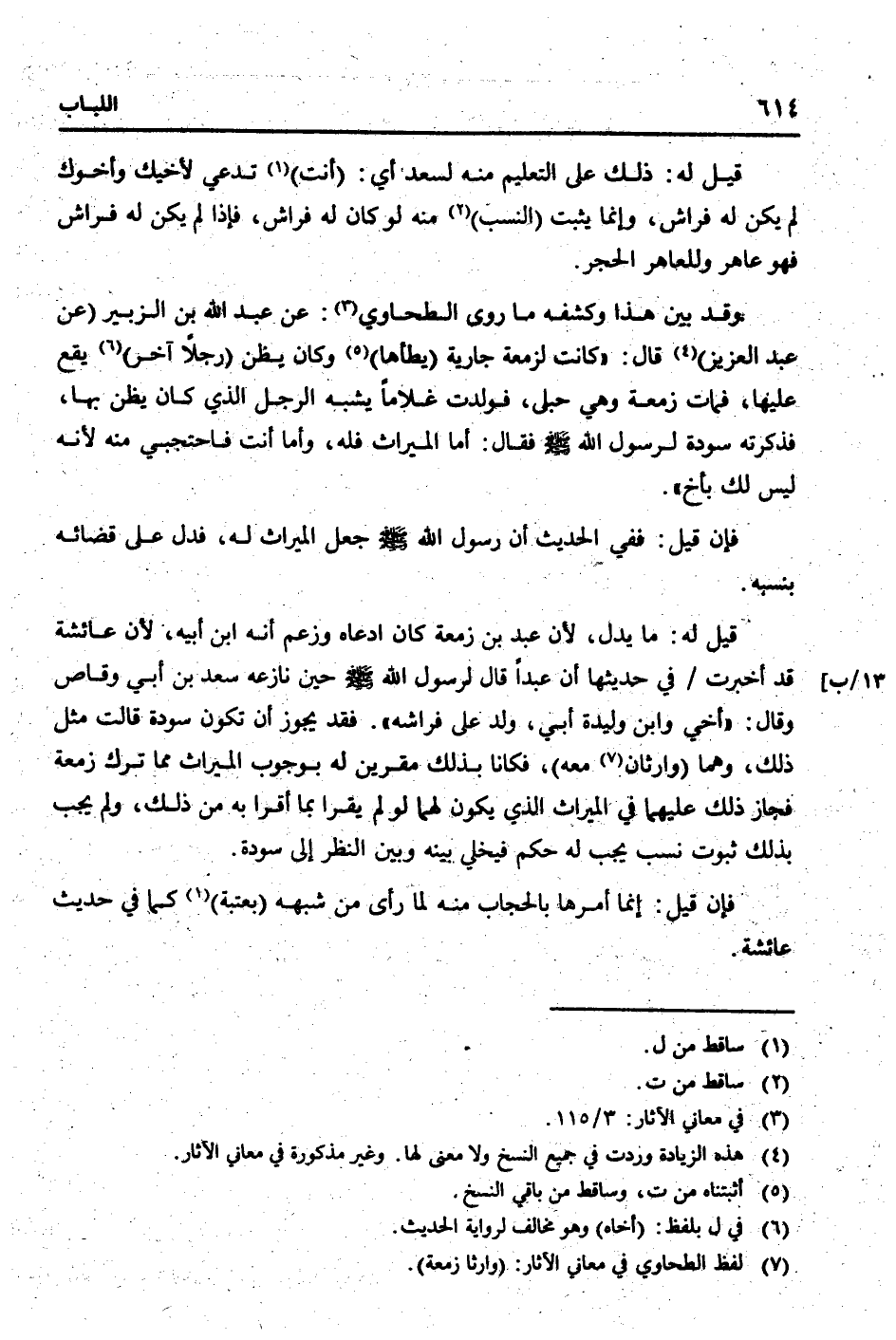 وَقد بَين هَذَا وكشفه مَا روى الطَّحَاوِيّ: عَن عبد الله بن الزبير (عَن عبد الْعَزِيز) قَالَ: " كَانَت لزمعة جَارِيَة (يَطَأهَا) وَكَانَ يظنّ (رجلا آخر) يَقع عَلَيْهَا، فَمَاتَ زَمعَة وَهِي حُبْلَى، فَولدت غُلَاما يشبه الرجل الَّذِي كَانَ يظنّ بهَا، فَذَكرته سَوْدَة لرَسُول الله [صلى الله عَلَيْهِ وَسلم] فَقَالَ: أما الْمِيرَاث فَلهُ، وَأما أَنْت فاحتجبي مِنْهُ لِأَنَّهُ لَيْسَ لَك بِأَخ ".
