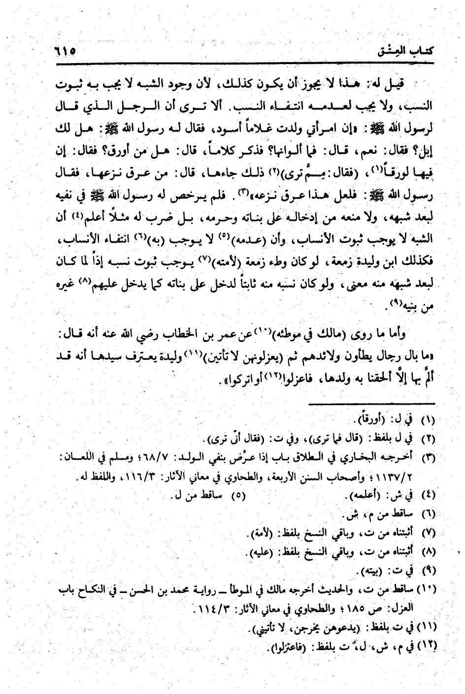 قيل لَهُ: هَذَا لَا يجوز أَن يكون كَذَلِك، لِأَن وجود الشّبَه لَا يجب بِهِ ثُبُوت النّسَب، وَلَا يجب لعدمه انْتِفَاء النّسَب. أَلا ترى أَن الرجل الَّذِي قَالَ لرَسُول الله [صلى الله عَلَيْهِ وَسلم] : " إِن امْرَأَتي ولدت غُلَاما أسود، فَقَالَ لَهُ رَسُول الله [صلى الله عَلَيْهِ وَسلم] : هَل لَك إبل؟ فَقَالَ: نعم، قَالَ: فَمَا ألوانها؟ فَذكر كلَاما، قَالَ: هَل من أَوْرَق؟ فَقَالَ: إِن فِيهَا لورقا، (فَقَالَ: مِم ترى) ذَلِك جاءها، قَالَ: من عرق نَزعهَا، فَقَالَ رَسُول الله [صلى الله عَلَيْهِ وَسلم] : فَلَعَلَّ هَذَا عرق نَزعه ". فَلم يرخص لَهُ رَسُول الله [صلى الله عَلَيْهِ وَسلم] فِي نَفْيه لبعد شبهه، وَلَا مَنعه من إِدْخَاله على بَنَاته وَحرمه، بل ضرب لَهُ مثلا أعلم أَن الشّبَه لَا يُوجب ثُبُوت الْأَنْسَاب، وَأَن (عَدمه) لَا يُوجب (بِهِ) انْتِفَاء الْأَنْسَاب، فَكَذَلِك ابْن وليدة زَمعَة، لَو كَانَ وَطْء زَمعَة (لأمته) يُوجب ثُبُوت نسبه إِذا لما كَانَ لبعد شبهه مِنْهُ معنى، وَلَو كَانَ نسبه مِنْهُ ثَابتا لدخل على بَنَاته كَمَا يدْخل عَلَيْهِم غَيره من بنيه.