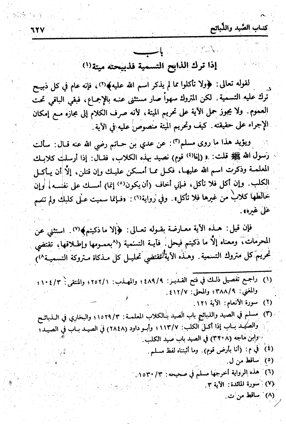 وَيُؤَيّد هَذَا مَا روى مُسلم: عَن عدي بن حَاتِم رَضِي الله عَنهُ قَالَ: سَأَلت رَسُول الله [صلى الله عَلَيْهِ وَسلم] قلت: (إِنَّا قوم) نصيد بِهَذِهِ الْكلاب، فَقَالَ: إِذا أرْسلت كلابك المعلمة وَذكرت اسْم الله عَلَيْهَا، فَكل مِمَّا أمسكن عَلَيْك وَإِن قتلن، إِلَّا أَن يَأْكُل الْكَلْب. وَإِن أكل فَلَا تَأْكُل، فَإِنِّي أَخَاف (أَن يكون إِنَّمَا) أمسك على نَفسه، وَإِن خالطها كلاب من غَيرهَا فَلَا تَأْكُل ". وَفِي رِوَايَة: " فَإِنَّمَا سميت على كلبك وَلم تسم على غَيره ".