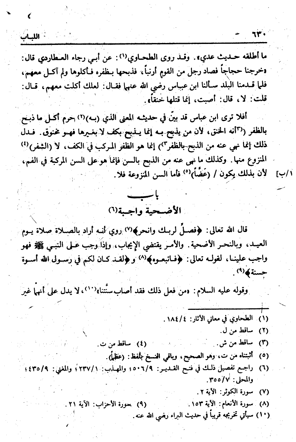 أَفلا ترى ابْن عَبَّاس قد بَين فِي حَدِيثه الْمَعْنى الَّذِي (بِهِ) حرم أكل مَا ذبح بالظفر (أَنه الخنق، لِأَن من يذبح بِهِ إِنَّمَا يذبح بكف لَا بغَيْرهَا فَهُوَ مخنوق. فَدلَّ ذَلِك إِنَّمَا نهي عَنهُ من الذّبْح بالظفر) إِنَّمَا هُوَ الظفر الْمركب فِي الْكَفّ، لَا (الشفر) المنزوع مِنْهَا. وَكَذَلِكَ مَا نهى عَنهُ من الذّبْح بِالسِّنِّ فَإِنَّمَا هُوَ على السن المركبة فِي الْفَم، لِأَن بذلك يكون / (عضا) فَأَما السن المنزوعة فَلَا.
