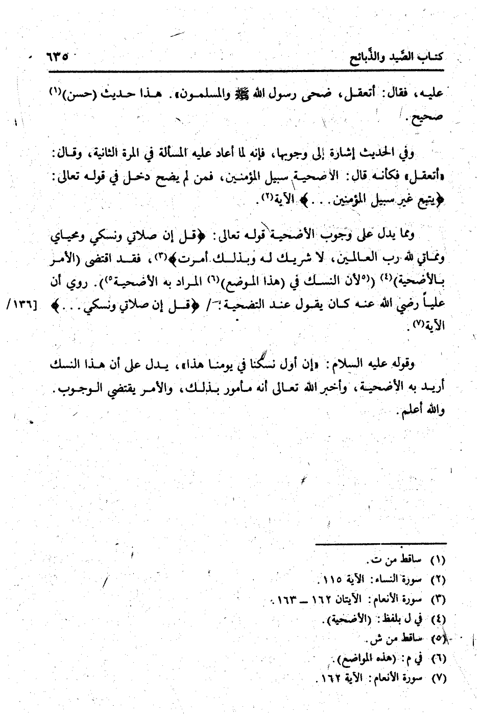 وَمِمَّا يدل على وجوب الْأُضْحِية قَوْله تَعَالَى: {قل إِن صَلَاتي ونسكي ومحياي ومماتي لله رب الْعَالمين لَا شريك لَهُ وَبِذَلِك أمرت} ، فقد اقْتضى (الْأَمر بالضحية) (لِأَن النّسك فِي (هَذَا الْموضع) المُرَاد بِهِ الْأُضْحِية) . رُوِيَ أَن عليا رَضِي الله عَنهُ كَانَ يَقُول عِنْد بالأضحية: / {قل إِن صَلَاتي ونسكي} الْآيَة.