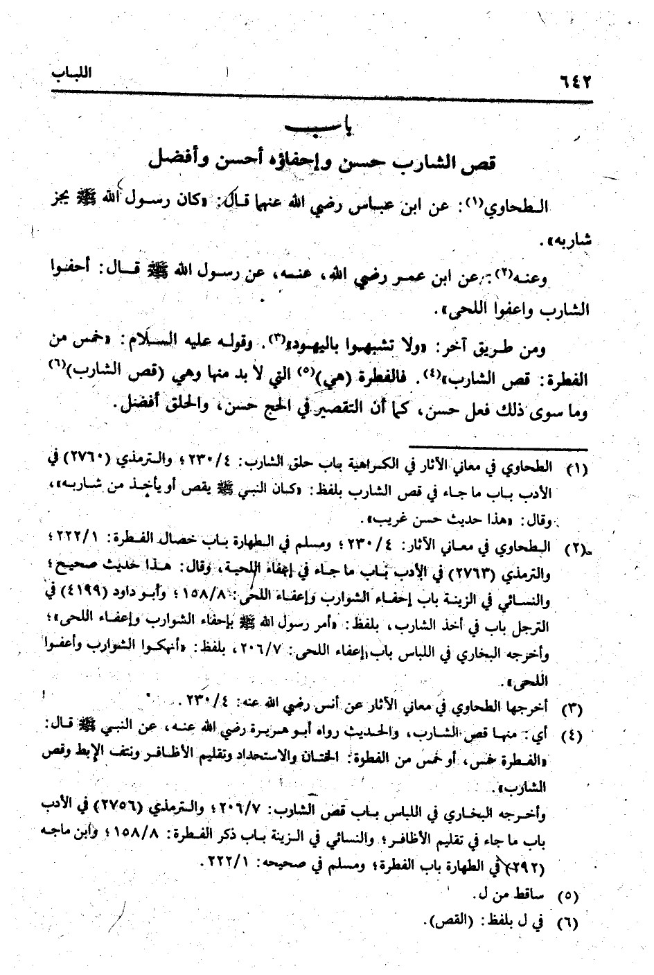 الطَّحَاوِيّ: عَن ابْن عَبَّاس رَضِي الله عَنْهُمَا قَالَ: " كَانَ رَسُول الله [صلى الله عَلَيْهِ وَسلم] يجز شَاربه ".