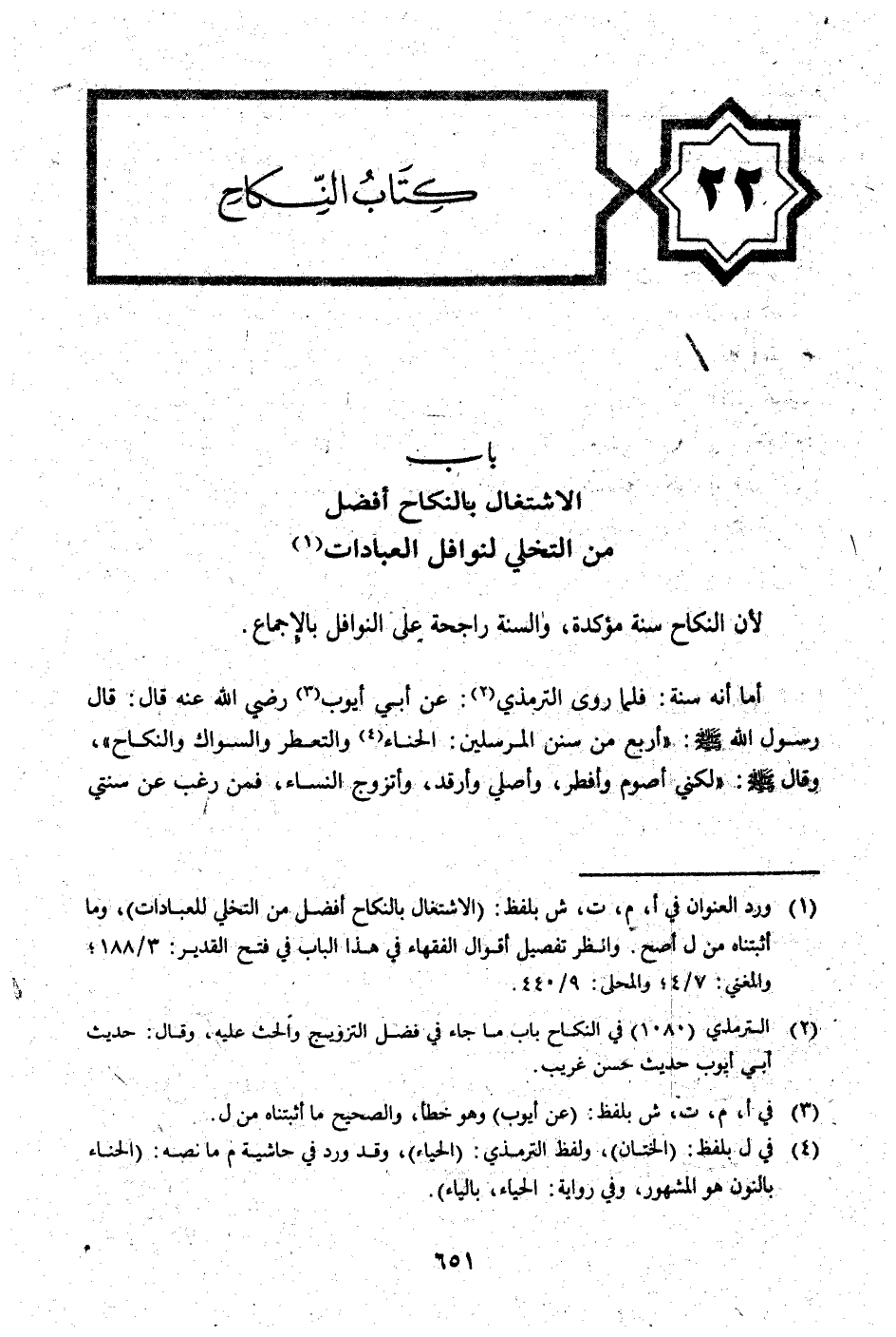 (بَاب الِاشْتِغَال بِالنِّكَاحِ أفضل من التخلي لنوافل الْعِبَادَات)