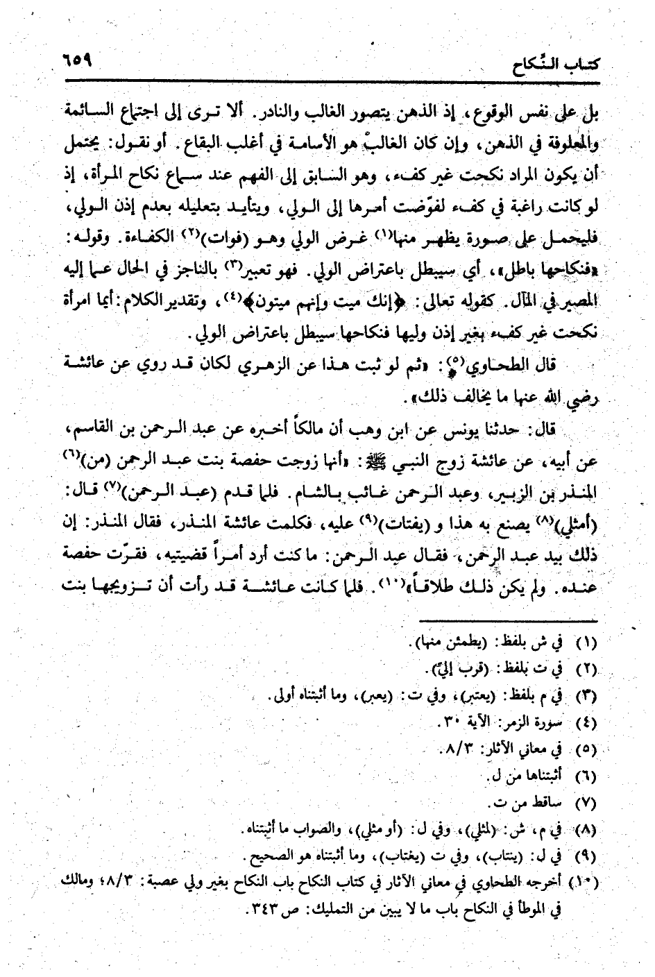 قَالَ: حَدثنَا يُونُس عَن ابْن وهب أَن مَالِكًا أخبرهُ عَن عبد الرَّحْمَن بن الْقَاسِم، عَن أَبِيه، عَن عَائِشَة زوج النَّبِي [صلى الله عَلَيْهِ وَسلم] : " أَنَّهَا زوجت حَفْصَة بنت عبد الرَّحْمَن (من) الْمُنْذر بن الزبير، وَعبد الرَّحْمَن غَائِب بِالشَّام. فَلَمَّا قدم (عبد الرَّحْمَن) قَالَ: (أمثلي) يصنع بِهِ هَذَا و (يفتات) عَلَيْهِ، فكلمت عَائِشَة الْمُنْذر، فَقَالَ الْمُنْذر: إِن ذَلِك بيد عبد الرَّحْمَن، فَقَالَ عبد الرَّحْمَن: مَا كنت أرد أمرا قضيتيه، فقرت حَفْصَة عِنْده. وَلم يكن ذَلِك طَلَاقا ". فَلَمَّا كَانَت عَائِشَة قد رَأَتْ أَن تَزْوِيجهَا بنت