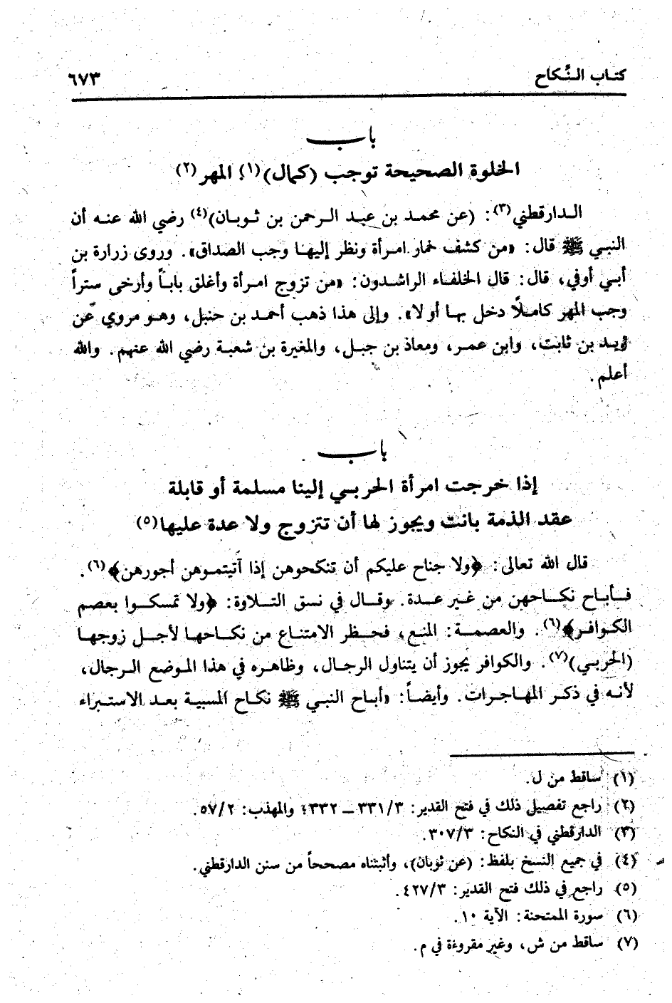 الدَّارَقُطْنِيّ: (عَن مُحَمَّد بن عبد الرَّحْمَن بن ثَوْبَان) رَضِي الله عَنهُ أَن النَّبِي [صلى الله عَلَيْهِ وَسلم] قَالَ: " من كشف خمار امْرَأَة وَنظر إِلَيْهَا وَجب الصَدَاق ". وروى زُرَارَة بن أبي أوفي، قَالَ: قَالَ الْخُلَفَاء الراشدون: " من تزوج امْرَأَة وأغلق بَابا وأرخى سترا وَجب الْمهْر كَامِلا دخل بهَا أَو لَا ". وَإِلَى هَذَا ذهب أَحْمد بن حَنْبَل، وَهُوَ مَرْوِيّ عَن زيد بن ثَابت، وَابْن عمر، ومعاذ بن جبل، والمغيرة بن شُعْبَة رَضِي الله عَنْهُم. وَالله أعلم.