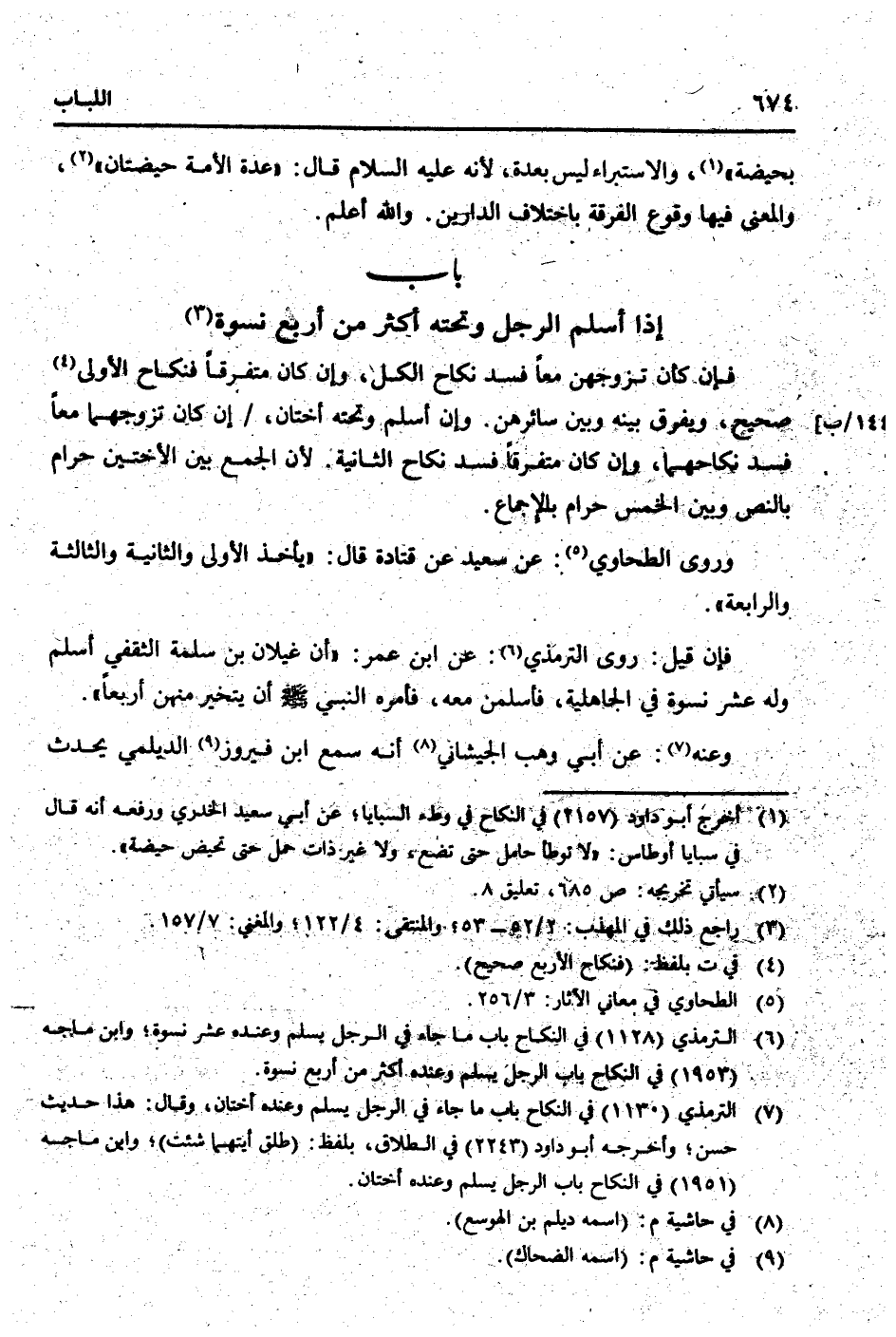 فَإِن قيل: روى التِّرْمِذِيّ: عَن ابْن عمر: " أَن غيلَان بن سَلمَة الثَّقَفِيّ أسلم وَله عشر نسْوَة فِي الْجَاهِلِيَّة، فأسلمن مَعَه، فَأمره النَّبِي [صلى الله عَلَيْهِ وَسلم] أَن يتَخَيَّر مِنْهُنَّ أَرْبعا ".