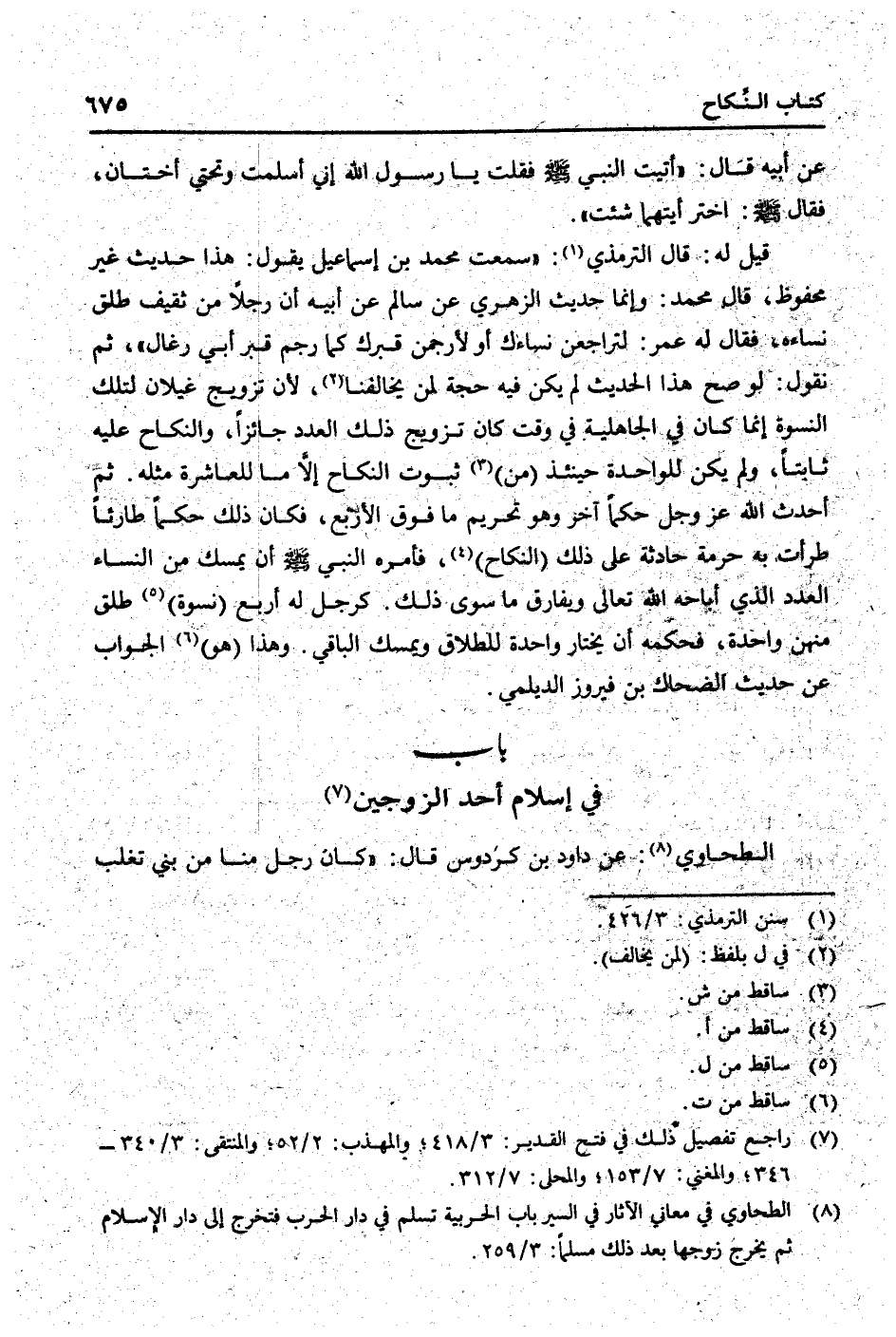 نقُول: لَو صَحَّ هَذَا الحَدِيث لم يكن فِيهِ حجَّة لمن يخالفنا، لِأَن تَزْوِيج غيلَان لتِلْك النسْوَة إِنَّمَا كَانَ فِي الْجَاهِلِيَّة فِي وَقت كَانَ تَزْوِيج ذَلِك الْعدَد جَائِزا، وَالنِّكَاح عَلَيْهِ ثَابتا، وَلم يكن للواحدة حِينَئِذٍ (من) ثُبُوت النِّكَاح إِلَّا مَا للعاشرة مثله. ثمَّ أحدث الله عز وَجل حكما آخر وَهُوَ تَحْرِيم مَا فَوق الْأَرْبَع، فَكَانَ ذَلِك حكما طارئا طرأت بِهِ حُرْمَة حَادِثَة على ذَلِك (النِّكَاح) ، فَأمره النَّبِي [صلى الله عَلَيْهِ وَسلم] أَن يمسك من النِّسَاء الْعدَد الَّذِي أَبَاحَهُ الله تَعَالَى وَيُفَارق مَا سوى ذَلِك. كَرجل لَهُ أَربع (نسْوَة) طلق مِنْهُنَّ وَاحِدَة، فَحكمه أَن يخْتَار وَاحِدَة للطَّلَاق ويمسك الْبَاقِي. وَهَذَا (هُوَ) الْجَواب عَن حَدِيث الضَّحَّاك بن فَيْرُوز الديلمي.