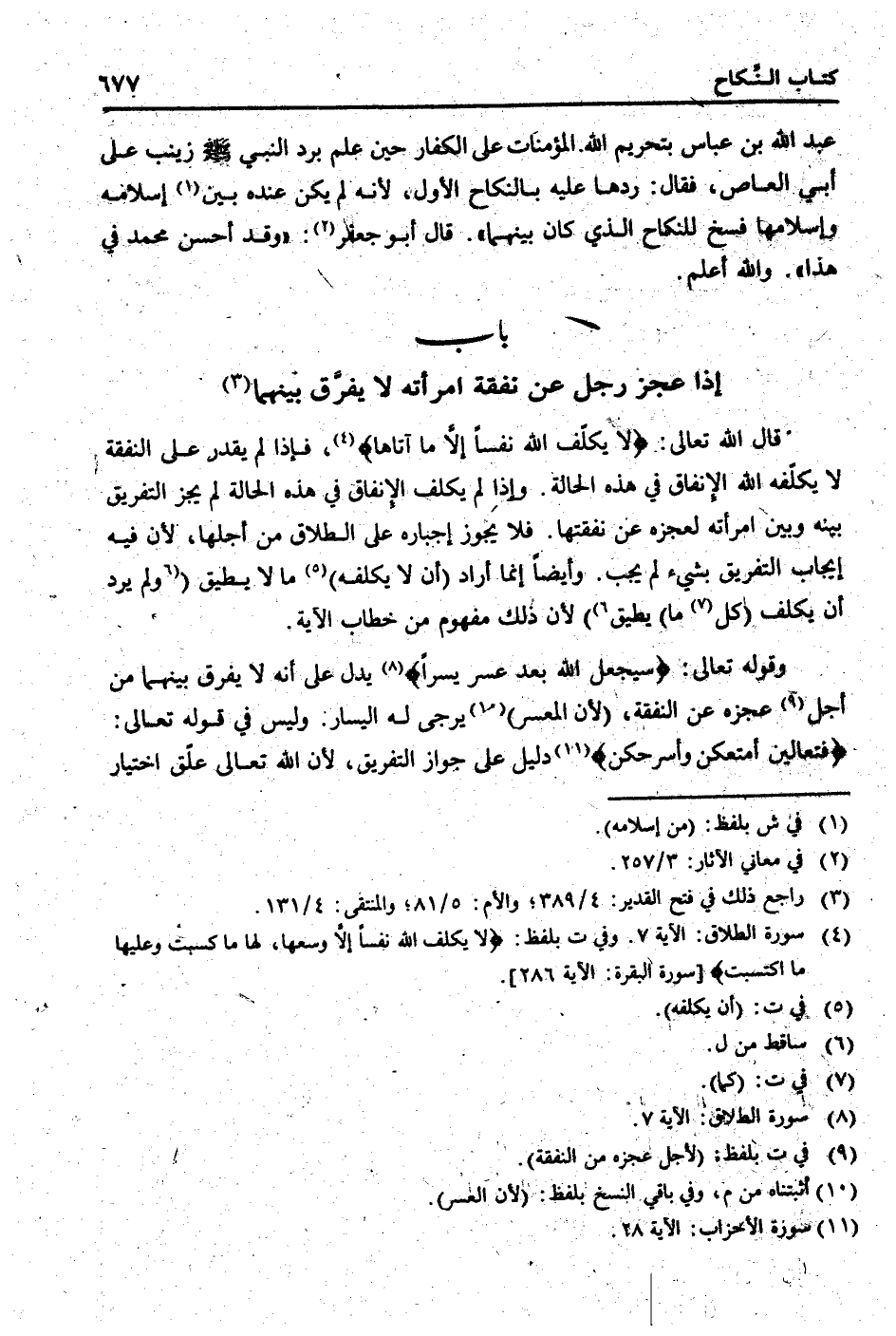 قَالَ الله تَعَالَى: {لَا يُكَلف الله نفسا إِلَّا مَا آتاها} ، فَإِذا لم يقدر على النَّفَقَة لَا يكلفه الله الْإِنْفَاق فِي هَذِه الْحَالة. وَإِذا لم يُكَلف الْإِنْفَاق فِي هَذِه الْحَالة لم يجز التَّفْرِيق بَينه وَبَين امْرَأَته لعَجزه عَن نَفَقَتهَا. فَلَا يجوز إِجْبَاره على الطَّلَاق من أجلهَا، لِأَن فِيهِ إِيجَاب التَّفْرِيق بِشَيْء لم يجب. وَأَيْضًا إِنَّمَا أَرَادَ (أَن لَا يكلفه) مَا لَا يُطيق (وَلم يرد أَن يُكَلف (كل مَا) يُطيق) لِأَن ذَلِك مَفْهُوم من خطاب الْآيَة.