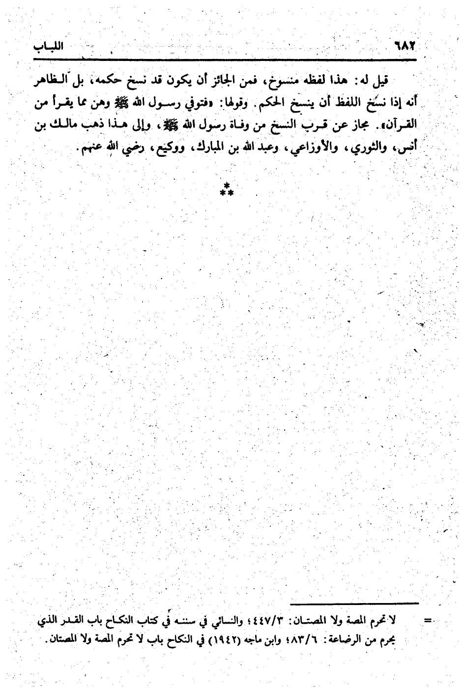 قيل لَهُ: هَذَا لَفظه مَنْسُوخ، فَمن الْجَائِز أَن يكون قد نسخ حكمه، بل الظَّاهِر أَنه إِذا نسخ اللَّفْظ أَن ينْسَخ الحكم. وَقَوْلها: " فَتوفي رَسُول الله [صلى الله عَلَيْهِ وَسلم] وَهن مِمَّا يقْرَأ من الْقُرْآن ". مجَاز عَن قرب النّسخ من وَفَاة رَسُول الله [صلى الله عَلَيْهِ وَسلم] ، وَإِلَى هَذَا ذهب مَالك بن أنس، وَالثَّوْري، وَالْأَوْزَاعِيّ، وَعبد الله بن الْمُبَارك، ووكيع، رَضِي الله عَنْهُم.