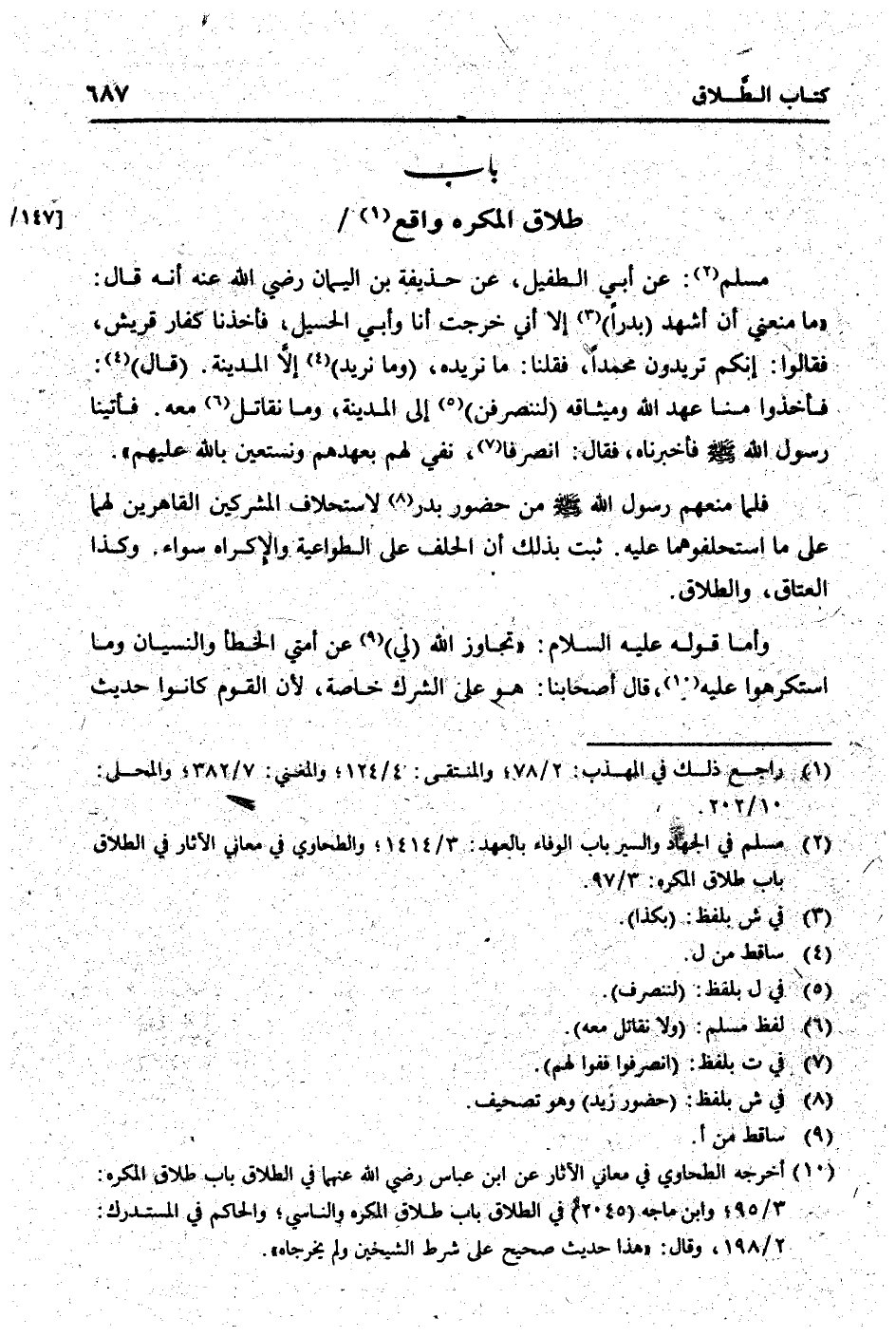 مُسلم: عَن أبي الطُّفَيْل، عَن حُذَيْفَة بن الْيَمَان رَضِي الله عَنهُ أَنه قَالَ: " مَا مَنَعَنِي أَن أشهد (بَدْرًا) إِلَّا أَنِّي خرجت أَنا وَأبي الحسيل، فأخذنا كفار قُرَيْش، فَقَالُوا: إِنَّكُم تُرِيدُونَ مُحَمَّدًا، فَقُلْنَا: مَا نريده، (مِمَّا نُرِيد) إِلَّا الْمَدِينَة. (قَالَ) : فَأخذُوا منا عهد الله وميثاقه (لننصرفن) إِلَى الْمَدِينَة، وَمَا نُقَاتِل مَعَه. فأتينا رَسُول الله [صلى الله عَلَيْهِ وَسلم] فَأَخْبَرنَاهُ، فَقَالَ: انصرفا، نفي لَهُم بعهدهم ونستعين بِاللَّه عَلَيْهِم ".