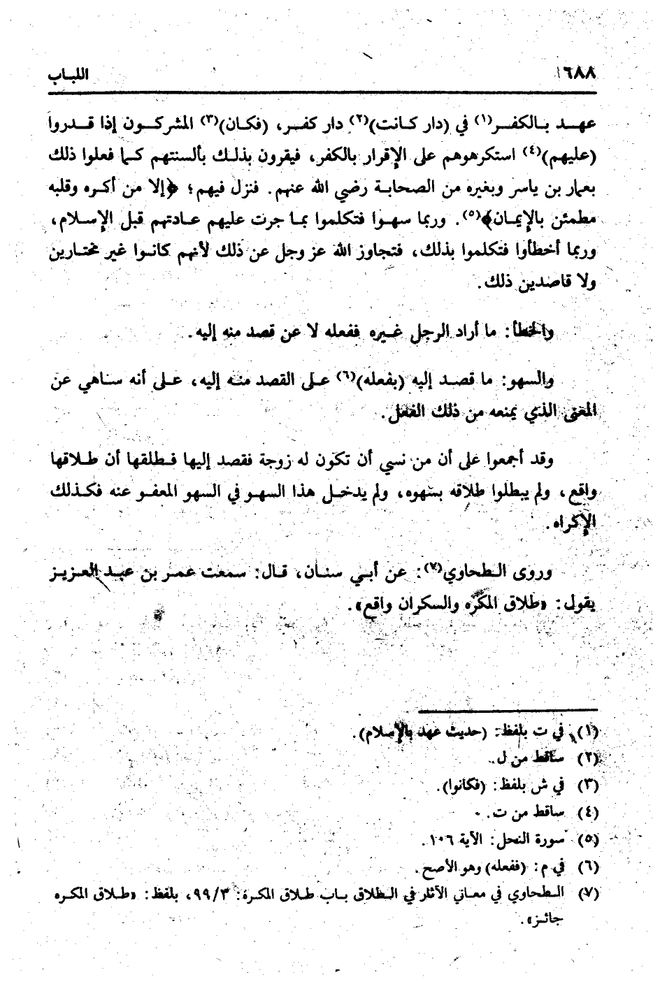 عهد بالْكفْر فِي (دَار كَانَت) دَار كفر، (فَكَانَ) الْمُشْركُونَ إِذا قدرُوا (عَلَيْهِم) استكرهوهم على الْإِقْرَار بالْكفْر، فيقرون بذلك بألستنهم كَمَا فعلوا ذَلِك بِعَمَّار بن يَاسر وَبِغَيْرِهِ من الصَّحَابَة رَضِي الله عَنْهُم. فَنزل فيهم؛ {إِلَّا من أكره وَقَلبه مطمئن بِالْإِيمَان} . وَرُبمَا سَهوا فتكلموا بِمَا جرت عَلَيْهِم عَادَتهم قبل الْإِسْلَام، وَرُبمَا أخطأوا فتكلموا بذلك، فَتَجَاوز الله عز وَجل عَن ذَلِك لأَنهم كَانُوا غير مختارين وَلَا قَاصِدين ذَلِك.