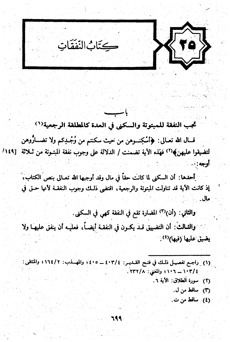 قَالَ الله تَعَالَى: {أسكنوهن من حَيْثُ سكنتم من وجدكم وَلَا تضاروهن لتضيقوا عَلَيْهِنَّ} فَهَذِهِ الْآيَة تَضَمَّنت / الدّلَالَة على جوب نَفَقَة المبتوتة من ثَلَاثَة أوجه: