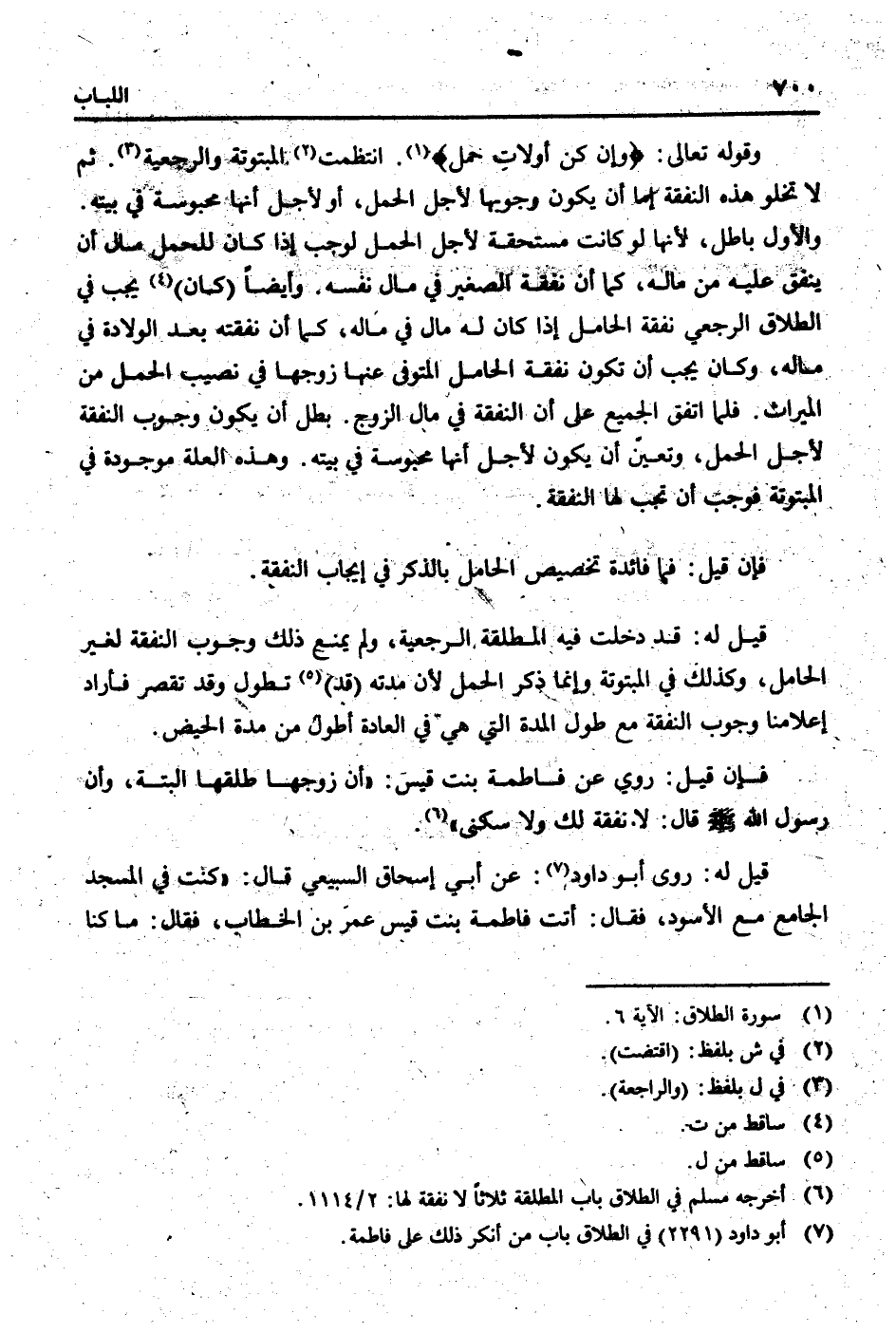 قيل لَهُ: قد دخلت فِيهِ الْمُطلقَة الرَّجْعِيَّة، وَلم يمْنَع ذَلِك وجوب النَّفَقَة لغير الْحَامِل، وَكَذَلِكَ فِي المبتوتة وَإِنَّمَا ذكر الْحمل لِأَن مدَّته (قد) تطول وَقد تقصر فَأَرَادَ إعلامنا وجوب النَّفَقَة مَعَ طول الْمدَّة الَّتِي هِيَ فِي الْعَادة أطول من مُدَّة الْحيض.