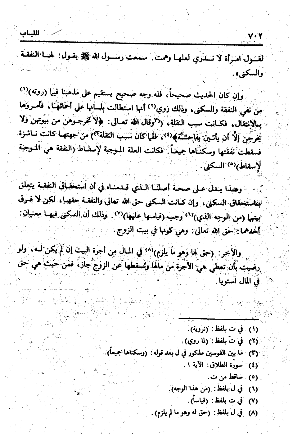 وَهَذَا يدل على صِحَة أصلنَا الَّذِي قدمْنَاهُ فِي أَن اسْتِحْقَاق النَّفَقَة يتَعَلَّق بِاسْتِحْقَاق السُّكْنَى، وَإِن كَانَت السُّكْنَى حق الله تَعَالَى وَالنَّفقَة حَقّهَا، لَكِن لَا فرق بَينهمَا (من الْوَجْه الَّذِي) وَجب (قياسها عَلَيْهَا) . وَذَلِكَ أَن السُّكْنَى فِيهَا مَعْنيانِ: أَحدهمَا: حق الله تَعَالَى: وَهِي كَونهَا فِي بَيت الزَّوْج.