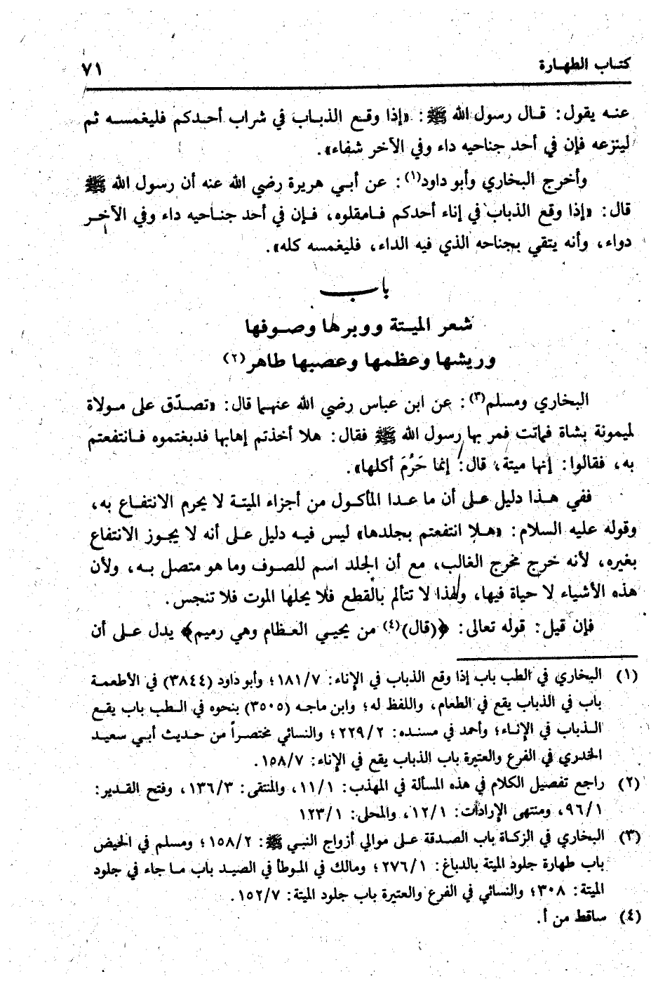 وَأخرج البُخَارِيّ وَأَبُو دَاوُد: عَن أبي هُرَيْرَة رَضِي الله عَنهُ أَن رَسُول الله [صلى الله عَلَيْهِ وَسلم] قَالَ: " إِذا وَقع الذُّبَاب فِي إِنَاء أحدكُم فامقلوه، فَإِن فِي أحد جناحيه دَاء وَفِي الآخر دَوَاء، وَأَنه يَتَّقِي بجناحه الَّذِي فِيهِ الدَّاء، فليغمسه كُله ".