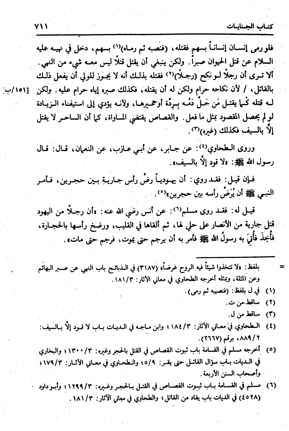 فَلَو رمى إِنْسَان إنْسَانا بِسَهْم فَقتله، (فنصبه ثمَّ رَمَاه) بِسَهْم، دخل فِي نَهْيه عَلَيْهِ السَّلَام عَن قتل الْحَيَوَان صبرا. وَلَكِن يَنْبَغِي أَن يقتل قتلا لَيْسَ مَعَه شَيْء من النَّهْي. أَلا ترى أَن رجلا لَو نكح (رجلا) فَقتله بذلك أَنه لَا يجوز للْوَلِيّ أَن يفعل ذَلِك بالقاتل، / لِأَن نِكَاحه حرَام وَلَكِن لَهُ أَن يقْتله، فَكَذَلِك صبره إِيَّاه حرَام عَلَيْهِ. وَلَكِن لَهُ قَتله كَمَا يقتل من حل دَمه بردة أَو غَيرهَا، وَلِأَنَّهُ يُؤَدِّي إِلَى اسْتِيفَاء الزِّيَادَة لَو لم يحصل الْمَقْصُود بِمثل مَا فعل. وَالْقصاص يَقْتَضِي الْمُسَاوَاة، كَمَا أَن السَّاحر لَا يقتل إِلَّا بِالسَّيْفِ فَكَذَلِك (غَيره) .