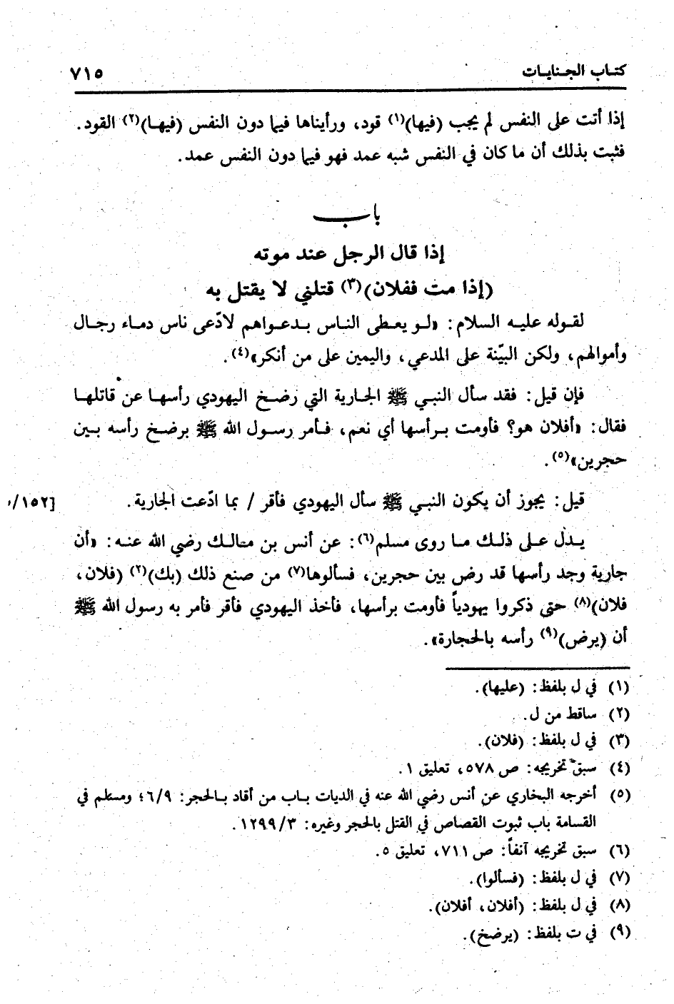 يدل على ذَلِك مَا روى مُسلم: عَن أنس بن مَالك رَضِي الله عَنهُ: " أَن جَارِيَة وجد رَأسهَا قد رض بَين حجرين، فَسَأَلُوهَا من صنع ذَلِك (بك) (فلَان، فلَان) حَتَّى ذكرُوا يَهُودِيّا فأومت برأسها، فَأخذ الْيَهُودِيّ فَأقر فَأمر بِهِ رَسُول الله [صلى الله عَلَيْهِ وَسلم] أَن (يرض) رَأسه بِالْحِجَارَةِ ".