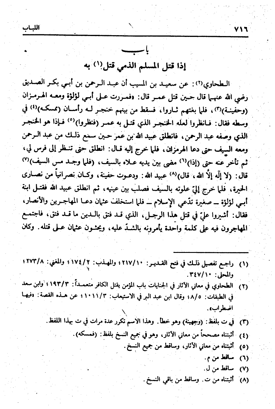 الطَّحَاوِيّ: عَن سعيد بن الْمسيب أَن عبد الرَّحْمَن بن أبي بكر الصّديق رَضِي الله عَنْهُمَا قَالَ حِين قتل عمر قَالَ: " فمررت على أبي لؤلؤة وَمَعَهُ الهرمزان (وحفينه) ، فَلَمَّا بغتهم ثَارُوا، فَسقط من بَينهم خنجر لَهُ رأسان (ممسكه) فِي وَسطه فَقَالَ: فانظروا لَعَلَّه الخنجر الَّذِي قتل بِهِ عمر (فنظروا) فَإِذا هُوَ الخنجر الَّذِي وَصفه عبد الرَّحْمَن، فَانْطَلق عبيد الله بن عمر حِين سمع ذَلِك من عبد الرَّحْمَن وَمَعَهُ السَّيْف حَتَّى دَعَا الهرمزان، فَلَمَّا خرج إِلَيْهِ قَالَ: انْطلق حَتَّى تنظر إِلَى فرس لي، ثمَّ تَأَخّر عَنهُ حَتَّى) إِذا) مضى بَين يَدَيْهِ علاهُ بِالسَّيْفِ، (فَلَمَّا وجد مس السَّيْف) قَالَ: (لَا إِلَه إِلَّا الله، قَالَ) عبيد الله: ودعوت حفينة، وَكَانَ نَصْرَانِيّا من نَصَارَى الْحيرَة، فَلَمَّا خرج إِلَيّ علوته بِالسَّيْفِ فصلب بَين عَيْنَيْهِ، ثمَّ انْطلق عبيد الله فَقتل ابْنة أبي لؤلؤة - صَغِيرَة تَدعِي الْإِسْلَام - فَلَمَّا اسْتخْلف عُثْمَان دَعَا الْمُهَاجِرين وَالْأَنْصَار، فَقَالَ: أَشِيرُوا عَليّ فِي قتل هَذَا الرجل، الَّذِي قد فتق بِالدّينِ مَا قد فتق، فَاجْتمع الْمُهَاجِرُونَ فِيهِ على كلمة وَاحِدَة يأمرونه بالشد عَلَيْهِ، ويحثون عُثْمَان على قَتله. وَكَانَ