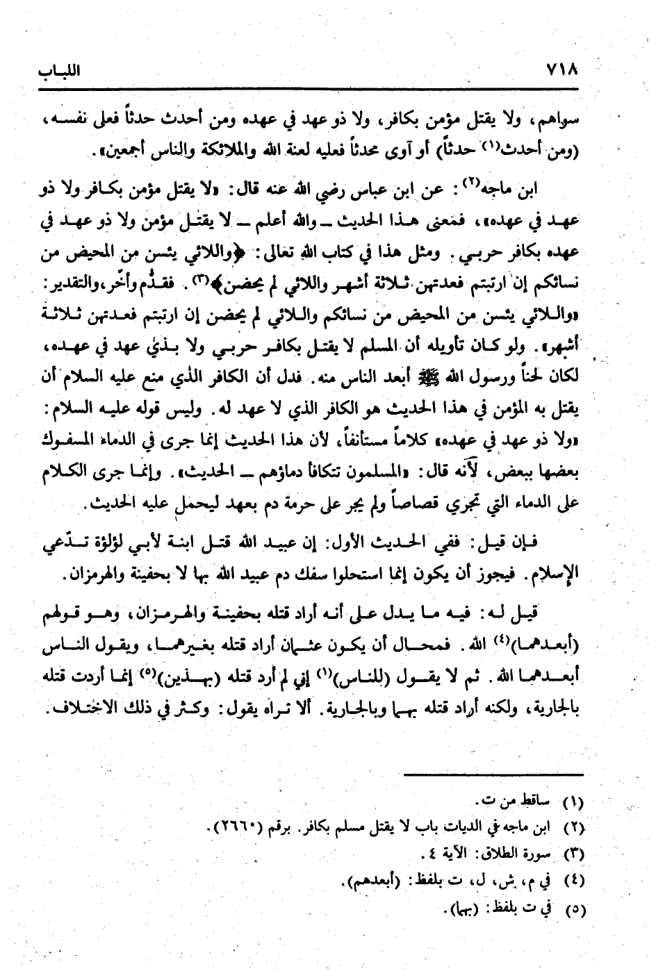 ابْن مَاجَه: عَن ابْن عَبَّاس رَضِي الله عَنهُ قَالَ: " لَا يقتل مُؤمن بِكَافِر وَلَا ذُو عهد فِي عَهده "، فَمَعْنَى هَذَا الحَدِيث - وَالله أعلم - لَا يقتل مُؤمن وَلَا ذُو عهد فِي عَهده بِكَافِر حَرْبِيّ. وَمثل هَذَا فِي كتاب الله تَعَالَى: {واللائي يئسن من الْمَحِيض من نِسَائِكُم إِن ارتبتم فعدتهن ثَلَاثَة أشهر واللائي لم يحضن} . فَقدم وَأخر، وَالتَّقْدِير: " {واللائي يئسن من الْمَحِيض من نِسَائِكُم واللائي لم يحضن إِن ارتبتم فعدتهن ثَلَاثَة أشهر ". وَلَو كَانَ تَأْوِيله أَن الْمُسلم لَا يقتل بِكَافِر حَرْبِيّ وَلَا بِذِي عهد فِي عَهده، لَكَانَ لحنا وَرَسُول الله [صلى الله عَلَيْهِ وَسلم] أبعد النَّاس مِنْهُ. فَدلَّ أَن الْكَافِر الَّذِي منع عَلَيْهِ السَّلَام أَن يقتل بِهِ الْمُؤمن فِي هَذَا الحَدِيث هُوَ الْكَافِر الَّذِي لَا عهد لَهُ. وَلَيْسَ قَوْله عَلَيْهِ السَّلَام: " وَلَا ذُو عهد فِي عَهده " كلَاما مستأنفا، لِأَن هَذَا الحَدِيث إِنَّمَا جرى فِي الدِّمَاء المسفوك بَعْضهَا بِبَعْض، لِأَنَّهُ قَالَ: " الْمُسلمُونَ تَتَكَافَأ دِمَاؤُهُمْ - الحَدِيث ". وَإِنَّمَا جرى الْكَلَام على الدِّمَاء الَّتِي تجْرِي قصاصا وَلم يجر على حُرْمَة دم بِعَهْد ليحمل عَلَيْهِ الحَدِيث.