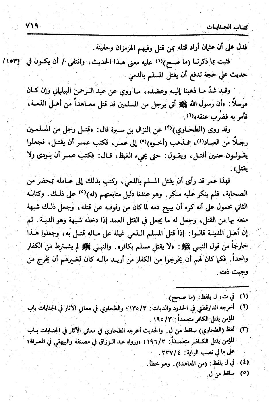 فَهَذَا عمر قد رأى أَن يقتل الْمُسلم بالذمي، وَكتب بذلك إِلَى عَامله بِمحضر من الصَّحَابَة، فَلم يُنكر عَلَيْهِ مُنكر. وَهُوَ عندنَا دَلِيل متابعتهم (لَهُ) على ذَلِك. وَكتابه الثَّانِي مَحْمُول على أَنه كره أَن يُبِيح دَمه لما كَانَ من وُقُوفه عَن قَتله، وَجعل ذَلِك شُبْهَة مَنعه بهَا من الْقَتْل، وَجعل لَهُ مَا يَجْعَل فِي الْقَتْل الْعمد إِذا دخله شُبْهَة وَهُوَ الدِّيَة. ثمَّ إِن أهل الْمَدِينَة قَالُوا: إِذا قتل الْمُسلم الذِّمِّيّ غيلَة على مَاله قتل بِهِ، وَجعلُوا هَذَا خَارِجا من قَول النَّبِي [صلى الله عَلَيْهِ وَسلم] : " لَا يقتل مُسلم بِكَافِر ". وَالنَّبِيّ [صلى الله عَلَيْهِ وَسلم] لم يشْتَرط من الْكفَّار وَاحِدًا. فَكَمَا كَانَ لَهُم أَن يخرجُوا من الْكفَّار من أُرِيد مَاله كَانَ لغَيرهم أَن يخرج من وَجَبت ذمَّته.