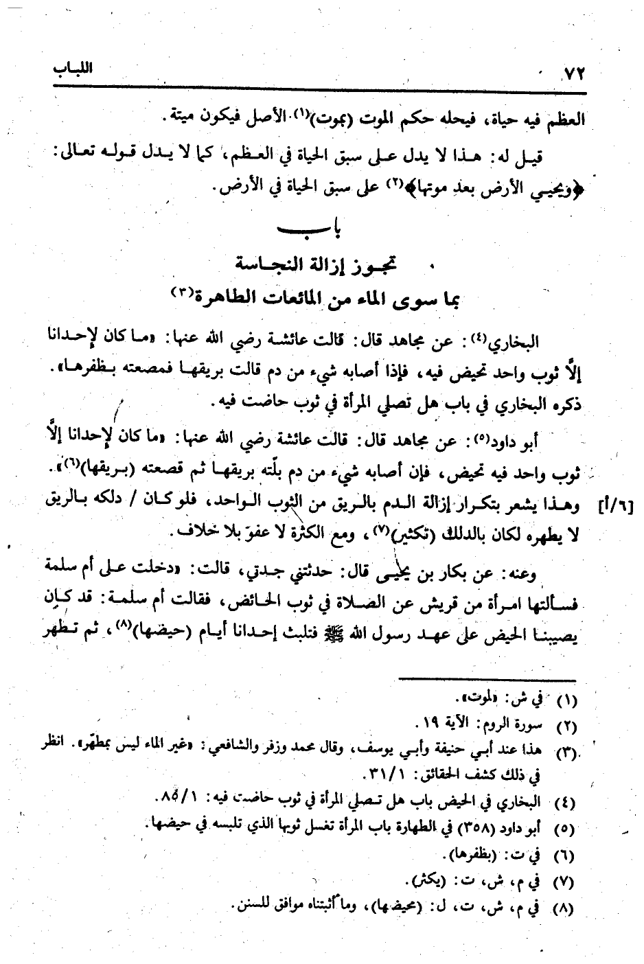 البُخَارِيّ: عَن مُجَاهِد قَالَ: قَالَت عَائِشَة رَضِي الله عَنْهَا: " مَا كَانَ لإحدانا إِلَّا ثوب وَاحِد تحيض فِيهِ، فَإِذا أَصَابَهُ شَيْء من دم قَالَت بريقها فمصعته بظفرها ". ذكره البُخَارِيّ فِي بَاب هَل تصلي الْمَرْأَة فِي ثوب حَاضَت فِيهِ.