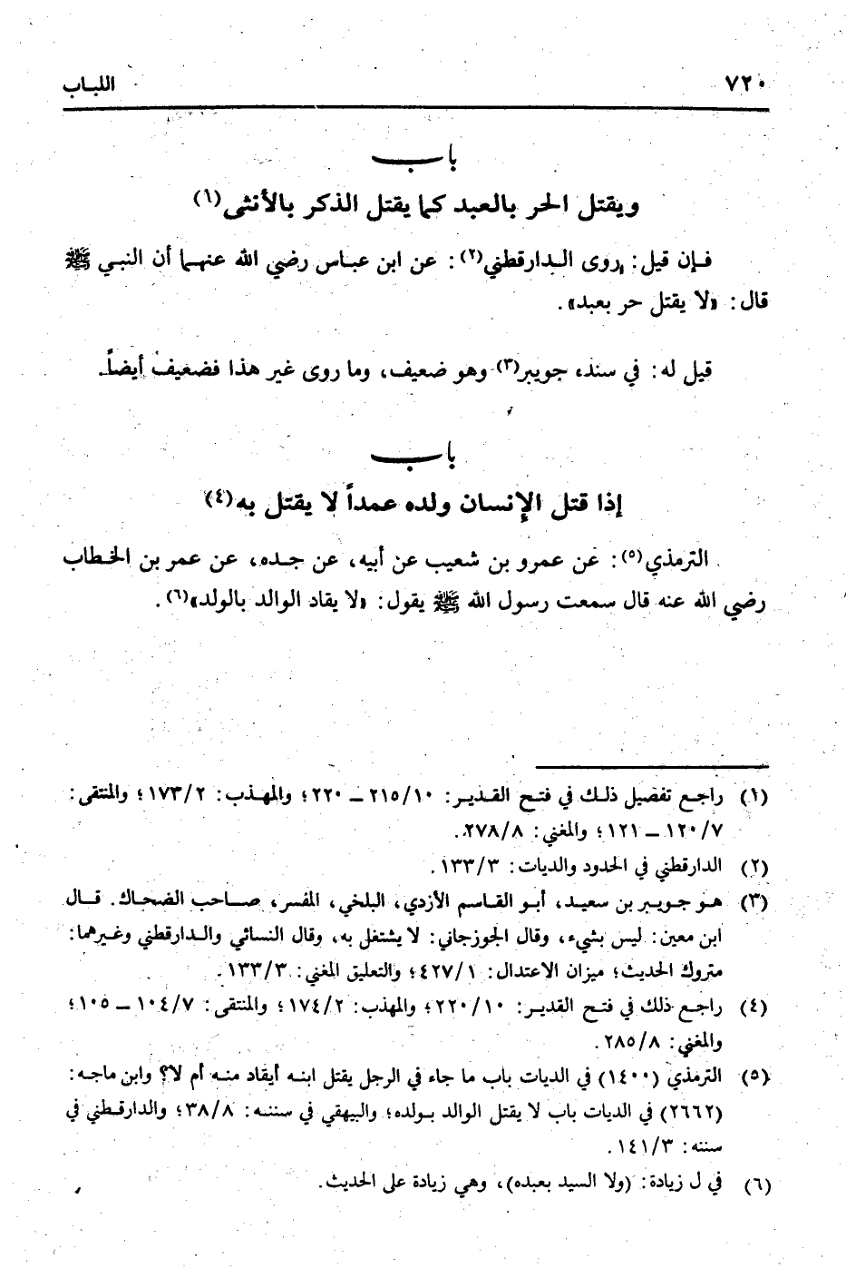 التِّرْمِذِيّ: عَن عَمْرو بن شُعَيْب عَن أَبِيه، عَن جده، عَن عمر بن الْخطاب رَضِي الله عَنهُ قَالَ سَمِعت رَسُول الله [صلى الله عَلَيْهِ وَسلم] يَقُول: " لَا يُقَاد الْوَالِد بِالْوَلَدِ ".