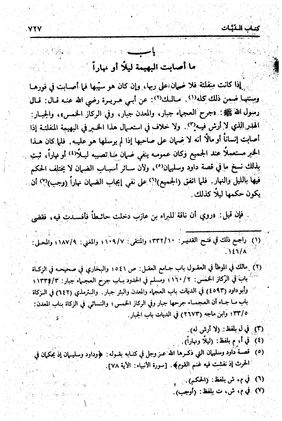 إِذا كَانَت منفلتة فَلَا ضَمَان على رَبهَا، وَإِن كَانَ هُوَ سيبها فَمَا أَصَابَت فِي فورها وسننها ضمن ذَلِك كُله. مَالك: عَن أبي هُرَيْرَة رَضِي الله عَنهُ قَالَ: قَالَ رَسُول الله [صلى الله عَلَيْهِ وَسلم] : " جرح العجماء جَبَّار، والمعدن جَبَّار، وَفِي الرِّكَاز الْخمس "، والجبار: الهدر الَّذِي لَا ارش فِيهِ. وَلَا خلاف فِي اسْتِعْمَال هَذَا الْخَبَر فِي الْبَهِيمَة المنفلتة إِذا أَصَابَت إنْسَانا أَو مَالا أَنه لَا ضَمَان على صَاحبهَا إِذا لم يرسلها هُوَ عَلَيْهِ. فَلَمَّا كَانَ هَذَا الْخَبَر مُسْتَعْملا عِنْد الْجَمِيع وَكَانَ عُمُومه يَنْفِي ضَمَان مَا تصيبه لَيْلًا أَو نَهَارا، ثَبت بذلك نسخ مَا فِي قصَّة دَاوُد وَسليمَان، وَلِأَن سَائِر أَسبَاب الضَّمَان لَا يخْتَلف الحكم فِيهَا بِاللَّيْلِ وَالنَّهَار. فَلَمَّا اتّفق (الْجَمِيع) على نفي إِيجَاب الضَّمَان نَهَارا (وَجب) أَن يكون حكمهمَا لَيْلًا كَذَلِك.