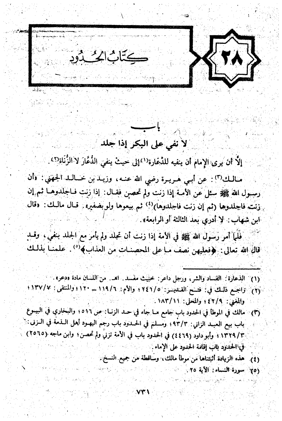 مَالك: عَن أبي هُرَيْرَة رَضِي الله عَنهُ، وَزيد بن خَالِد الْجُهَنِيّ: " أَن رَسُول الله [صلى الله عَلَيْهِ وَسلم] سُئِلَ عَن الْأمة إِذا زنت وَلم تحصن فَقَالَ: إِذا زنت فاجلدوها ثمَّ إِن زنت فاجلدوها (ثمَّ إِن زنت فاجلدوها) ثمَّ بيعوها وَلَو بضفير ". قَالَ مَالك: " قَالَ ابْن شهَاب: لَا أَدْرِي بعد الثَّالِثَة أَو الرَّابِعَة ".