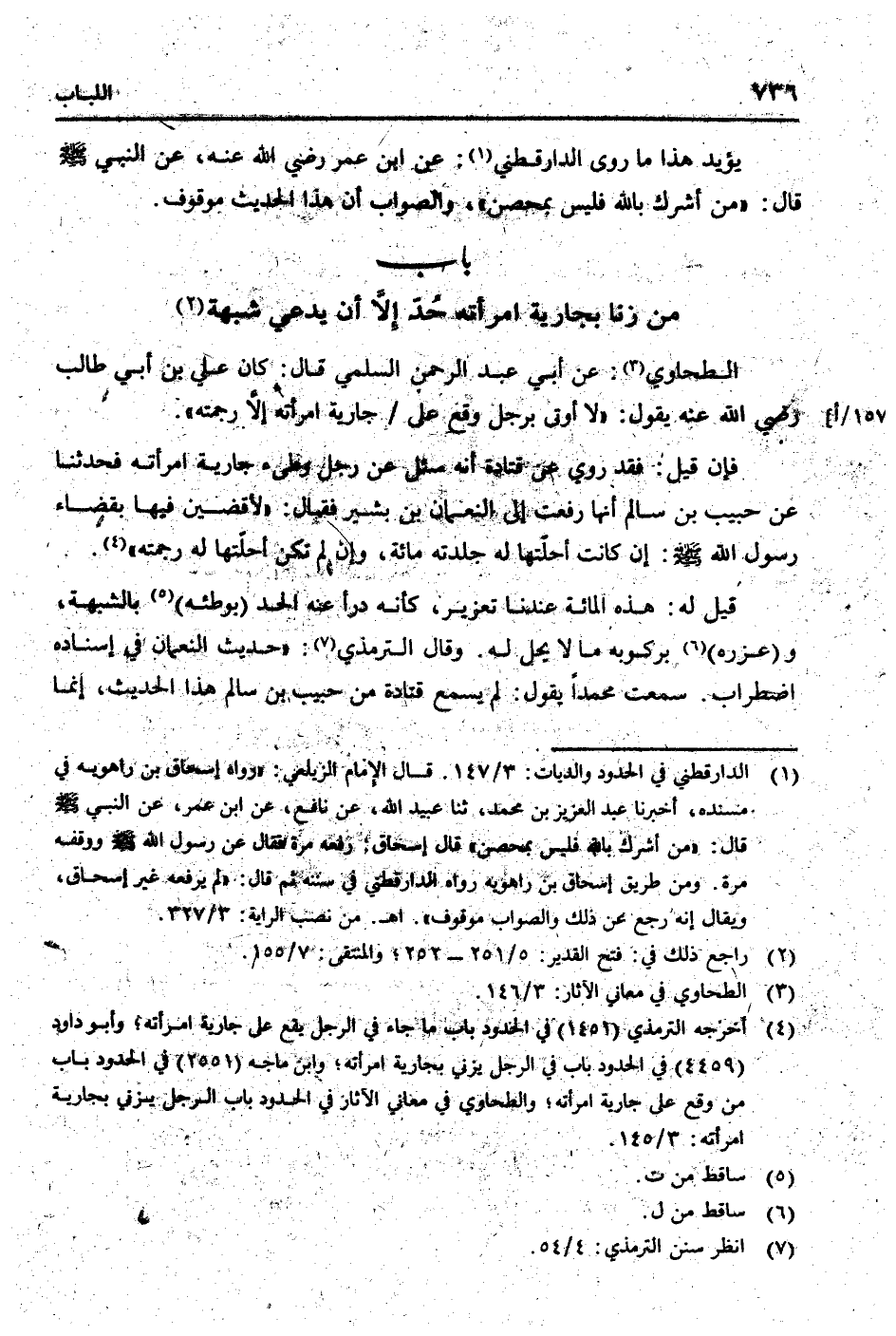 الطَّحَاوِيّ: عَن أبي عبد الرَّحْمَن السّلمِيّ قَالَ: كَانَ عَليّ بن أبي طَالب رَضِي الله عَنهُ يَقُول: " لَا أُوتى بِرَجُل وَقع على / جَارِيَة امْرَأَته إِلَّا رَجَمْته ".