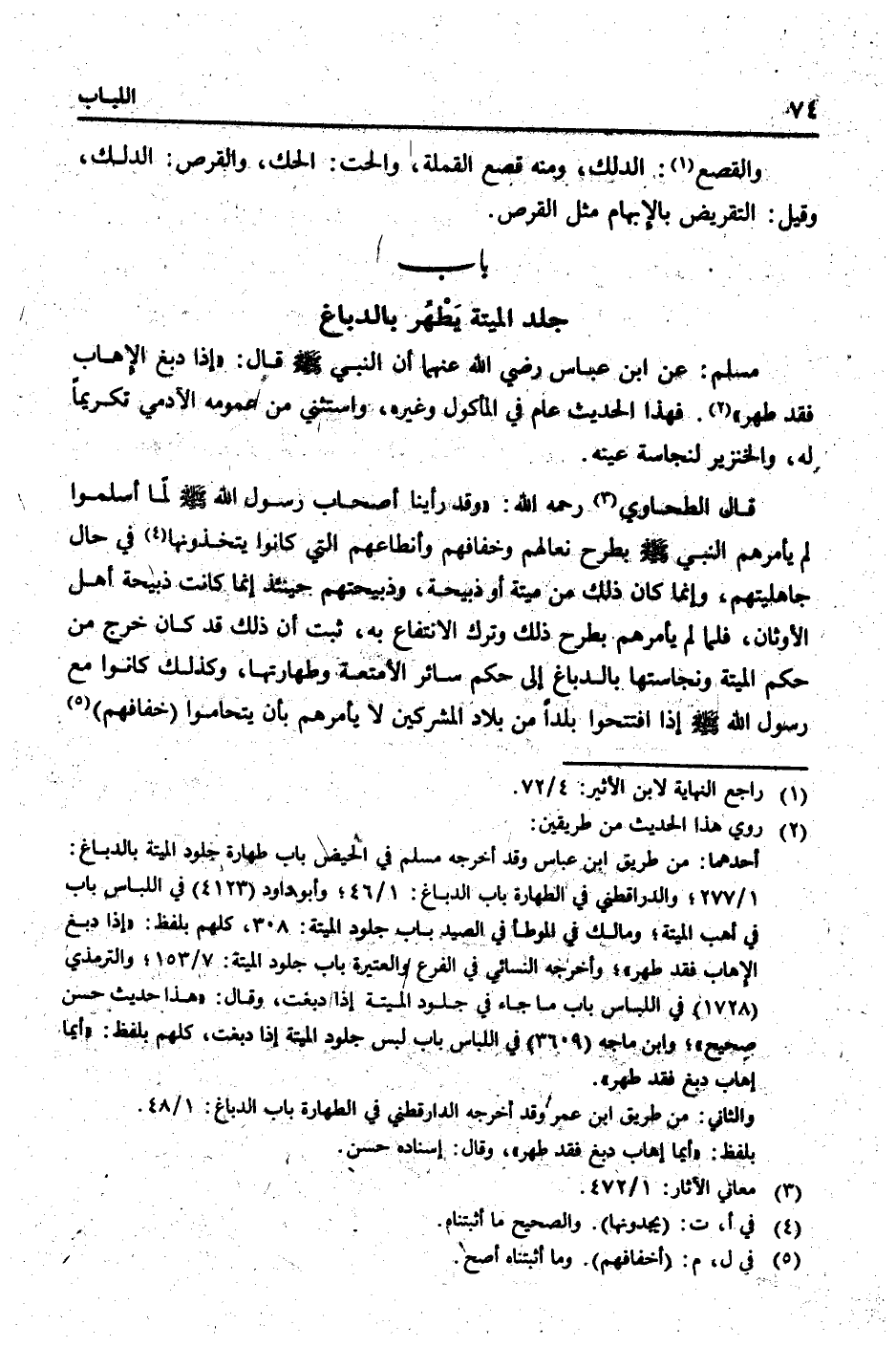 قَالَ الطَّحَاوِيّ رَحمَه الله: " وَقد رَأينَا أَصْحَاب رَسُول الله [صلى الله عَلَيْهِ وَسلم] لما أَسْلمُوا لم يَأْمُرهُم النَّبِي [صلى الله عَلَيْهِ وَسلم] بطرح نعَالهمْ وخفافهم وأنطاعهم الَّتِي كَانُوا يتخذونها فِي حَال جاهليتهم، وَإِنَّمَا كَانَ ذَلِك من ميتَة أَو ذَبِيحَة، وذبيحتهم حِينَئِذٍ إِنَّمَا كَانَت ذَبِيحَة أهل الْأَوْثَان، فَلَمَّا لم يَأْمُرهُم بطرح ذَلِك وَترك الِانْتِفَاع بِهِ، ثَبت أَن ذَلِك قد كَانَ خرج من حكم الْميتَة ونجاستها بالدباغ إِلَى حكم سَائِر الْأَمْتِعَة وطهارتها، وَكَذَلِكَ كَانُوا مَعَ رَسُول الله [صلى الله عَلَيْهِ وَسلم] إِذا افتتحوا بَلَدا من بِلَاد الْمُشْركين لَا يَأْمُرهُم بِأَن يتحاموا (خفافهم)