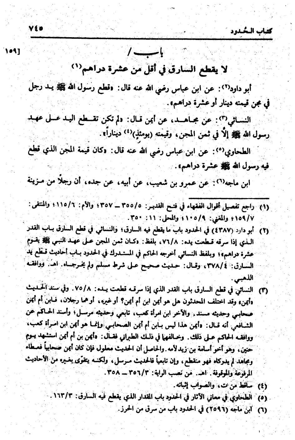 أَبُو دَاوُد: عَن ابْن عَبَّاس رَضِي الله عَنهُ قَالَ: " قطع رَسُول الله [صلى الله عَلَيْهِ وَسلم] يَد رجل فِي مجن قِيمَته دِينَار أَو عشرَة دَرَاهِم ".