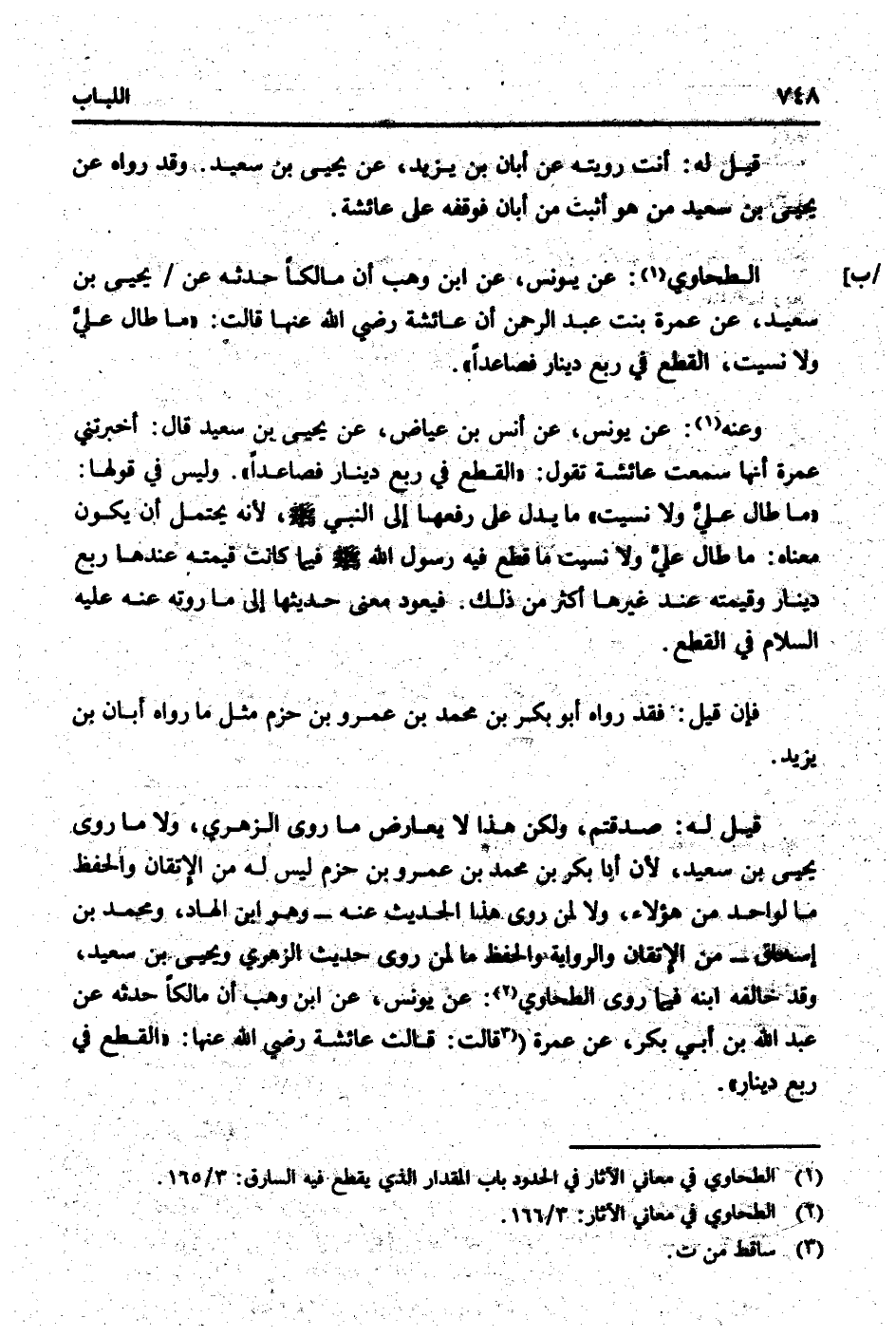 الطَّحَاوِيّ: عَن يُونُس، عَن ابْن وهب أَن مَالِكًا حَدثهُ عَن / يحيى بن سعيد، عَن عمْرَة بنت عبد الرَّحْمَن أَن عَائِشَة رَضِي الله عَنْهَا قَالَت: " مَا طَال عَليّ وَلَا نسيت، الْقطع فِي ربع دِينَار فَصَاعِدا ".