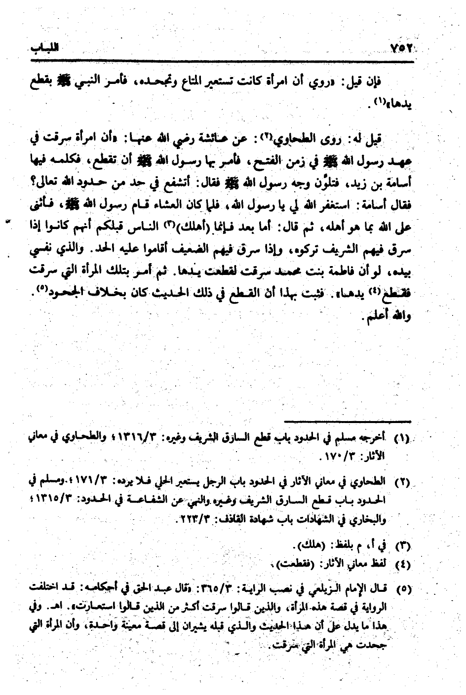 قيل لَهُ: روى الطَّحَاوِيّ: عَن عَائِشَة رَضِي الله عَنْهَا: " أَن امْرَأَة سرقت فِي عهد رَسُول الله [صلى الله عَلَيْهِ وَسلم] فِي زمن الْفَتْح، فَأمر بهَا رَسُول الله [صلى الله عَلَيْهِ وَسلم] أَن تقطع، فَكَلمهُ فِيهَا أُسَامَة بن زيد، فَتَلَوَّنَ وَجه رَسُول الله [صلى الله عَلَيْهِ وَسلم] فَقَالَ: أَتَشفع فِي حد من حُدُود الله تَعَالَى؟ فَقَالَ أُسَامَة: اسْتغْفر الله لي يَا رَسُول الله، فَلَمَّا كَانَ الْعشَاء قَامَ رَسُول الله [صلى الله عَلَيْهِ وَسلم] ، فَأثْنى على الله بِمَا هُوَ أَهله، ثمَّ قَالَ: أما بعد فَإِنَّمَا (أهلك) النَّاس قبلكُمْ أَنهم كَانُوا إِذا سرق فيهم الشريف تَرَكُوهُ، وَإِذا سرق فيهم الضَّعِيف أَقَامُوا عَلَيْهِ الْحَد. وَالَّذِي نَفسِي بِيَدِهِ، لَو أَن فَاطِمَة بنت مُحَمَّد سرقت لَقطعت يَدهَا. ثمَّ أَمر بِتِلْكَ الْمَرْأَة الَّتِي سرقت فَقطع يَدهَا ". فَثَبت بِهَذَا أَن الْقطع فِي ذَلِك الحَدِيث كَانَ بِخِلَاف الْجُحُود. وَالله أعلم.