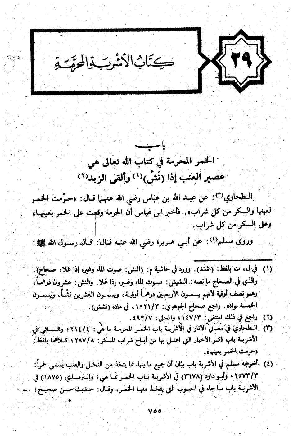 الطَّحَاوِيّ: عَن عبد الله بن عَبَّاس رَضِي الله عَنْهُمَا قَالَ: " حرمت الْخمر لعينها وَالسكر من كل شراب ". فَأخْبر ابْن عَبَّاس أَن الْحُرْمَة وَقعت على الْخمر بِعَينهَا، وعَلى السكر من كل شراب.