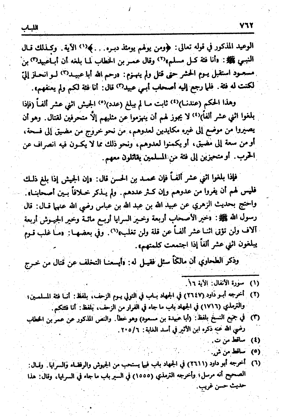 الْوَعيد الْمَذْكُور فِي قَوْله تَعَالَى: {وَمن يولهم يَوْمئِذٍ دبره} الْآيَة. وَكَذَلِكَ قَالَ النَّبِي [صلى الله عَلَيْهِ وَسلم] : " أَنا فِئَة كل مُسلم " وَقَالَ عمر بن الْخطاب لما بلغه أَن أَبَا عبيد بن مَسْعُود اسْتقْبل يَوْم الْحَشْر حَتَّى قتل وَلم ينهزم: " رحم الله أَبَا عبيد لَو انحاز إِلَيّ لَكُنْت لَهُ فِئَة. فَلَمَّا رَجَعَ إِلَيْهِ أَصْحَاب أبي عبيد قَالَ: أَنا فِئَة لكم وَلم يعنفهم ".