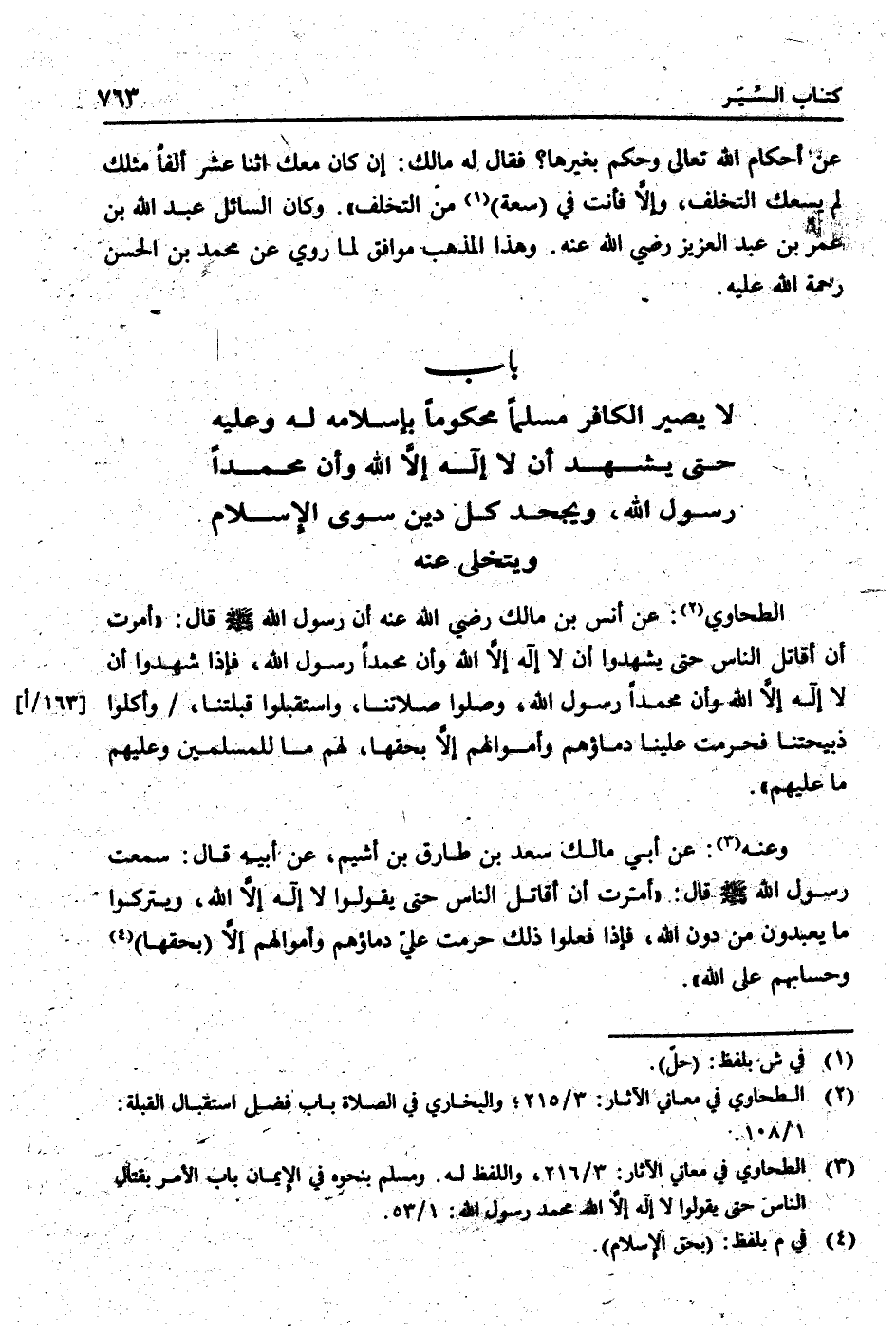 الطَّحَاوِيّ: عَن أنس بن مَالك رَضِي الله عَنهُ أَن رَسُول الله [صلى الله عَلَيْهِ وَسلم] قَالَ: " أمرت أَن أقَاتل النَّاس حَتَّى يشْهدُوا أَن لَا إِلَه إِلَّا الله وَأَن مُحَمَّدًا رَسُول الله، فَإِذا شهدُوا أَن لَا إِلَه إِلَّا الله وَأَن مُحَمَّدًا رَسُول الله، وصلوا صَلَاتنَا، واستقبلوا قبلتنا، / وأكلوا ذبيحتنا فَحرمت علينا دِمَاؤُهُمْ وَأَمْوَالهمْ إِلَّا بِحَقِّهَا، لَهُم مَا للْمُسلمين وَعَلَيْهِم مَا عَلَيْهِم ".
