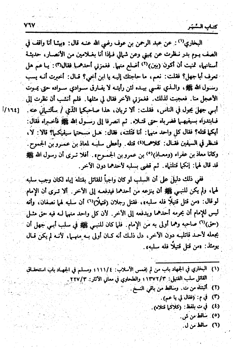 البُخَارِيّ: عَن عبد الرَّحْمَن بن عَوْف رَضِي الله عَنهُ قَالَ: " بَينا أَنا وَاقِف فِي الصَّفّ يَوْم بدر نظرت عَن يَمِيني وَعَن شمَالي فَإِذا أَنا بغلامين من الْأَنْصَار، حَدِيثَة أسنانهما، تمنيت أَن أكون (بَين) أضلع مِنْهُمَا. فغمزني أَحدهمَا فَقَالَ: يَا عَم هَل تعرف أَبَا جهل؟ فَقلت: نعم، مَا حَاجَتك إِلَيْهِ يَا ابْن أخي؟ قَالَ: أخْبرت أَنه يسب رَسُول الله [صلى الله عَلَيْهِ وَسلم] ، وَالَّذِي نَفسِي بِيَدِهِ لَئِن رَأَيْته لَا يُفَارق سوَادِي سوَاده حَتَّى يَمُوت الأعجل منا. فعجبت لذَلِك. فغمزني الآخر فَقَالَ لي مثلهَا. فَلم أنشب أَن نظرت إِلَى أبي جهل يجول فِي النَّاس، فَقلت: أَلا تريان، هَذَا صاحبكما الَّذِي / سألتماني عَنهُ. فابتدراه بسيفيهما فضرباه حَتَّى قتلاه. ثمَّ انصرفا إِلَى رَسُول الله [صلى الله عَلَيْهِ وَسلم] فَأَخْبَرَاهُ فَقَالَ: أيكما قَتله؟ فَقَالَ كل وَاحِد مِنْهُمَا: أَنا قتلته، فَقَالَ: هَل مسحتما سيفيكما؟ قَالَا: لَا، فَنظر فِي السيفين فَقَالَ: كِلَاهُمَا قَتله. وَأعْطى سلبه لِمعَاذ بن عَمْرو بن الجموح. وَكَانَا معَاذ بن عفراء (ومعاذ) بن عَمْرو بن الجموح ". أَفلا ترى أَن رَسُول الله [صلى الله عَلَيْهِ وَسلم] قد قَالَ لَهما: إنَّكُمَا قتلتماه. ثمَّ قضى بسلبه لأَحَدهمَا دون الآخر.