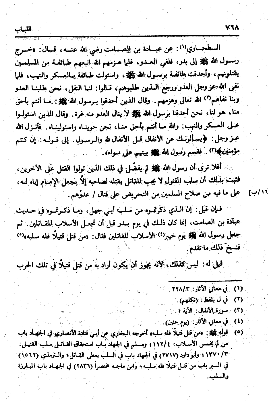 الطَّحَاوِيّ: عَن عبَادَة بن الصَّامِت رَضِي الله عَنهُ، قَالَ: " خرج رَسُول الله [صلى الله عَلَيْهِ وَسلم] إِلَى بدر، فلقي الْعَدو، فَلَمَّا هَزَمَهُمْ الله اتبعهم طَائِفَة من الْمُسلمين يَقْتُلُونَهُمْ، وَأَحْدَقَتْ طَائِفَة برَسُول الله [صلى الله عَلَيْهِ وَسلم] ، واستولت طَائِفَة بالعسكر والنهب، فَلَمَّا نفى الله عز وَجل الْعَدو وَرجع الَّذين طلبوهم، قَالُوا: لنا النَّفْل، نَحن طلبنا الْعَدو وبنا نفاهم الله تَعَالَى وَهَزَمَهُمْ. وَقَالَ الَّذين أَحدقُوا برَسُول الله [صلى الله عَلَيْهِ وَسلم] : مَا أَنْتُم بِأَحَق منا، هُوَ لنا، نَحن أَحدقنَا برَسُول الله [صلى الله عَلَيْهِ وَسلم] لَا ينَال الْعَدو مِنْهُ غرَّة. وَقَالَ الَّذين استولوا على الْعَسْكَر والنهب: وَالله مَا أَنْتُم بِأَحَق منا، نَحن حويناه واستوليناه. فَأنْزل الله عز وَجل: {يَسْأَلُونَك عَن الْأَنْفَال قل الْأَنْفَال لله وَالرَّسُول} . إِلَى قَوْله: {إِن كُنْتُم مُؤمنين} . فقسم رَسُول الله [صلى الله عَلَيْهِ وَسلم] بَينهم على سَوَاء ".