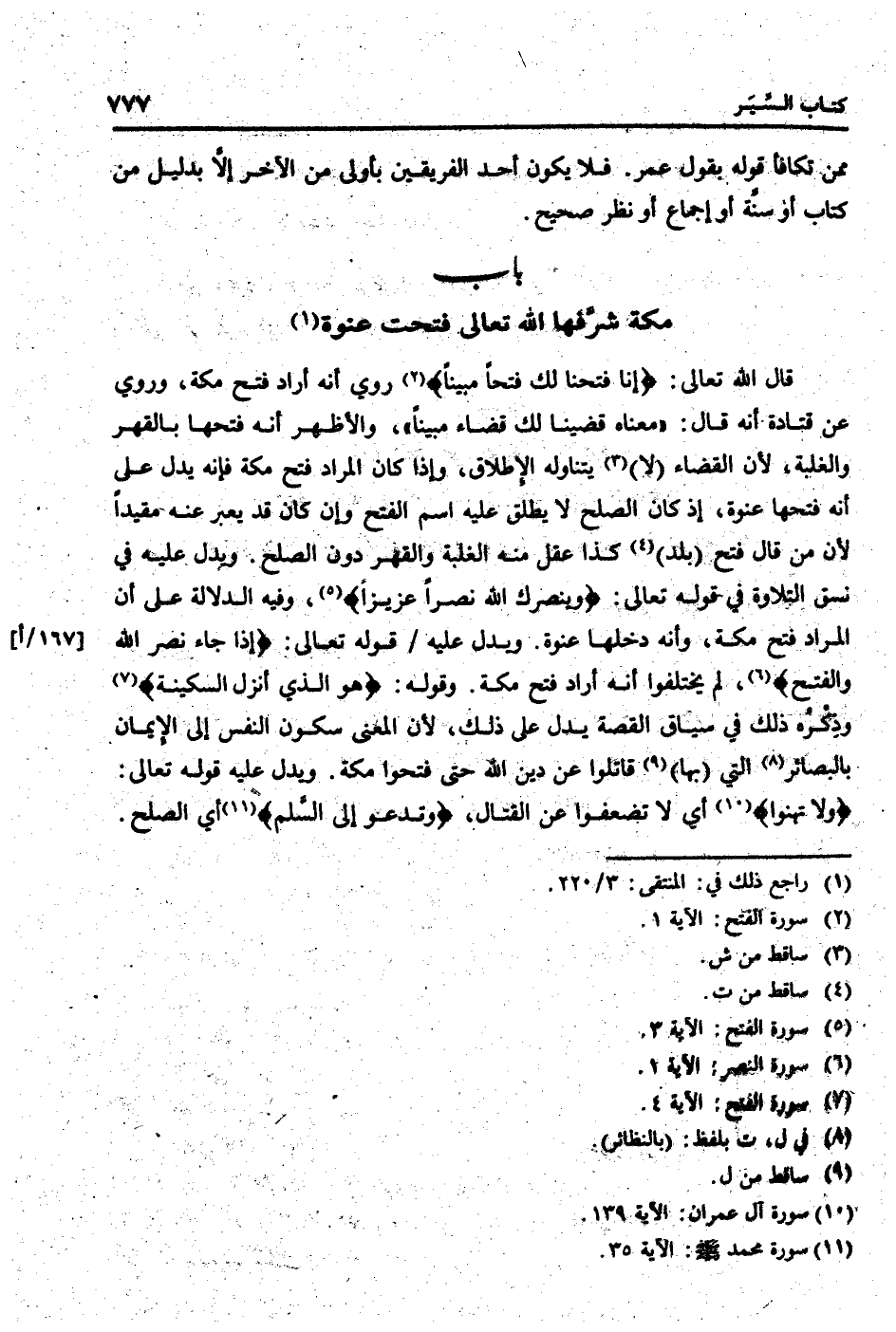 قَالَ الله تَعَالَى: {إِنَّا فتحنا لَك فتحا مُبينًا} رُوِيَ أَنه أَرَادَ فتح مَكَّة، وَرُوِيَ عَن قَتَادَة أَنه قَالَ: " مَعْنَاهُ قضينا لَك قَضَاء مُبينًا "، وَالْأَظْهَر أَنه فتحهَا بالقهر وَالْغَلَبَة، لِأَن الْقَضَاء (لَا) يتَنَاوَلهُ الْإِطْلَاق، وَإِذا كَانَ المُرَاد فتح مَكَّة فَإِنَّهُ يدل على أَنه فتحهَا عنْوَة، إِذْ كَانَ الصُّلْح لَا يُطلق عَلَيْهِ اسْم الْفَتْح وَإِن كَانَ قد يعبر عَنهُ مُقَيّدا لِأَن من قَالَ فتح (بلد) كَذَا عقل مِنْهُ الْغَلَبَة والقهر دون الصُّلْح. وَيدل عَلَيْهِ فِي نسق التِّلَاوَة فِي قَوْله تَعَالَى: {وينصرك الله نصرا عَزِيزًا} ، وَفِيه الدّلَالَة على أَن المُرَاد فتح مَكَّة، وَأَنه دَخلهَا عنْوَة. وَيدل عَلَيْهِ / قَوْله تَعَالَى: {إِذا جَاءَ نصر الله وَالْفَتْح} ، لم يَخْتَلِفُوا أَنه أَرَادَ فتح مَكَّة. وَقَوله: {هُوَ الَّذِي أنزل السكينَة} وَذكره ذَلِك فِي سِيَاق الْقِصَّة يدل على ذَلِك، لِأَن الْمَعْنى سُكُون النَّفس إِلَى الْإِيمَان بالبصائر الَّتِي (بهَا) قَاتلُوا عَن دين الله حَتَّى فتحُوا مَكَّة. وَيدل عَلَيْهِ قَوْله تَعَالَى: {وَلَا تهنوا} أَي لَا تضعفوا عَن الْقِتَال، {وَتَدعُوا إِلَى السّلم} أَي الصُّلْح.