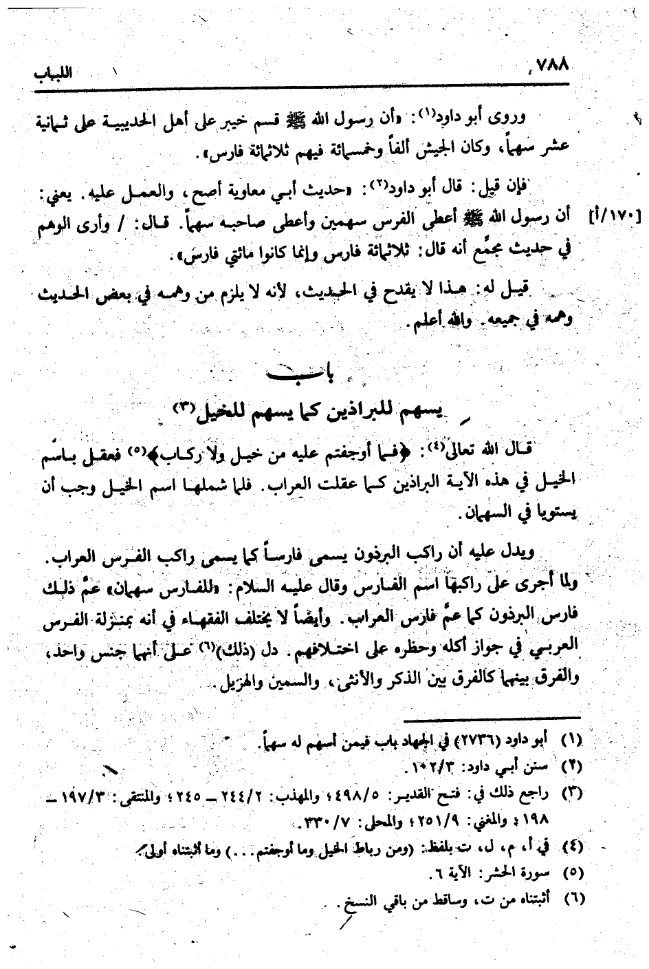 قَالَ الله تَعَالَى: {فَمَا أَوجَفْتُمْ عَلَيْهِ من خيل وَلَا ركاب} فعقل باسم الْخَيل فِي هَذِه الْآيَة البراذين كَمَا عقلت العراب. فَلَمَّا شملها اسْم الْخَيل وَجب أَن يستويا فِي السهْمَان.