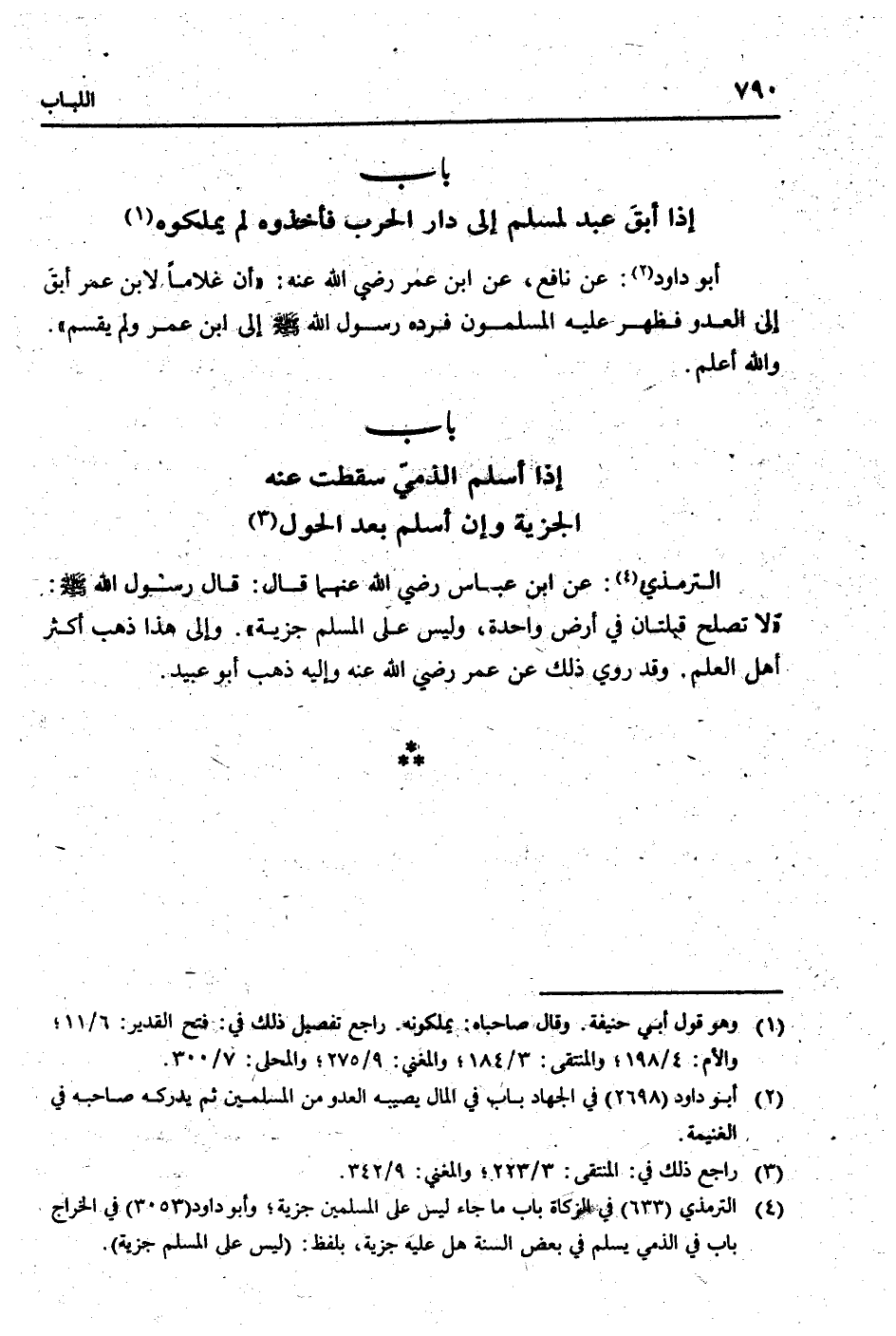 التِّرْمِذِيّ: عَن ابْن عَبَّاس رَضِي الله عَنْهُمَا قَالَ: قَالَ رَسُول الله [صلى الله عَلَيْهِ وَسلم] : " لَا تصلح قبلتان فِي أَرض وَاحِدَة، وَلَيْسَ على الْمُسلم جِزْيَة ". وَإِلَى هَذَا ذهب أَكثر أهل الْعلم. وَقد رُوِيَ ذَلِك عَن عمر رَضِي الله عَنهُ وَإِلَيْهِ ذهب أَبُو عبيد.