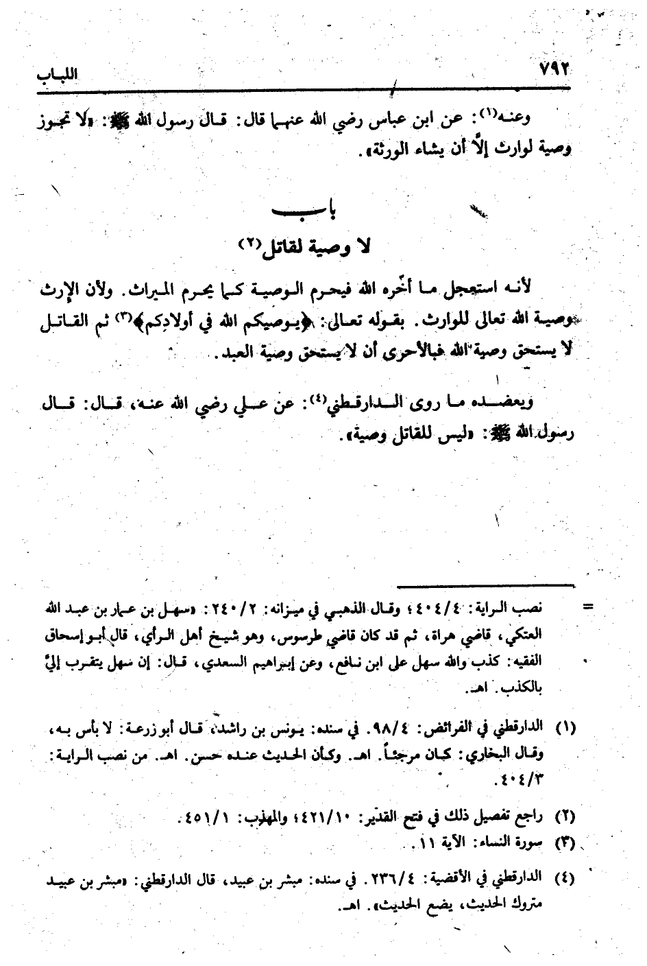 ويعضده مَا روى الدَّارَقُطْنِيّ: عَن عَليّ رَضِي الله عَنهُ، قَالَ: قَالَ رَسُول الله [صلى الله عَلَيْهِ وَسلم] : " لَيْسَ للْقَاتِل وَصِيَّة ".