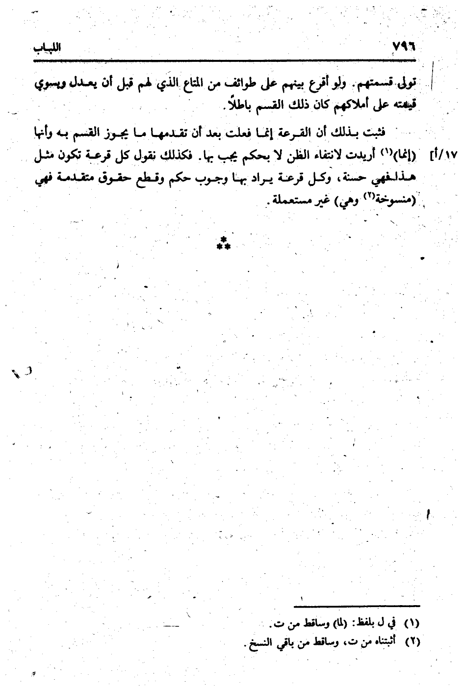 فَثَبت بذلك أَن الْقرعَة إِنَّمَا فعلت بعد أَن تقدمها مَا يجوز الْقسم بِهِ وَأَنَّهَا (إِنَّمَا) أريدت لانْتِفَاء الظَّن لَا بِحكم يجب بهَا. فَكَذَلِك نقُول كل قرعَة تكون مثل هَذَا فَهِيَ حَسَنَة، وكل قرعَة يُرَاد بهَا وجوب حكم وَقطع حُقُوق مُتَقَدّمَة فَهِيَ (مَنْسُوخَة وَهِي) غير مستعملة.