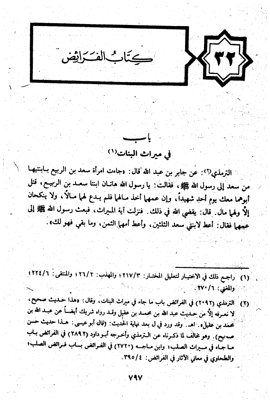 التِّرْمِذِيّ: عَن جَابر بن عبد الله قَالَ: " جَاءَت امْرَأَة سعد بن الرّبيع بابنتيها من سعد إِلَى رَسُول الله [صلى الله عَلَيْهِ وَسلم] ، فَقَالَت: يَا رَسُول الله هَاتَانِ ابنتا سعد بن الرّبيع، قتل أَبوهُمَا مَعَك يَوْم أحد شَهِيدا، وَإِن عَمهمَا أَخذ مَالهمَا فَلم يدع لَهما مَالا، وَلَا ينكحان إِلَّا وَلَهُمَا مَال. قَالَ: يقْضِي الله فِي ذَلِك. فَنزلت آيَة الْمِيرَاث، فَبعث رَسُول الله [صلى الله عَلَيْهِ وَسلم] إِلَى عَمهمَا فَقَالَ: أعْط لابنتي سعد الثُّلثَيْنِ، وَأعْطِ أمهما الثّمن، وَمَا بَقِي فَهُوَ لَك ".