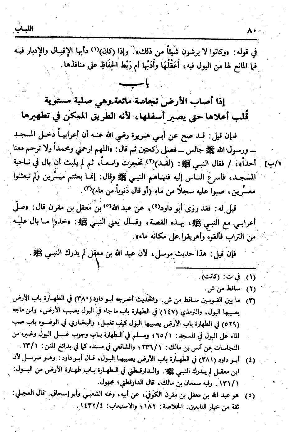 قيل لَهُ: فقد روى أَبُو دَاوُد، عَن عبد الله بن معقل بن مقرن قَالَ: " صلى أَعْرَابِي مَعَ النَّبِي [صلى الله عَلَيْهِ وَسلم] ، بِهَذِهِ الْقِصَّة، وَقَالَ يَعْنِي النَّبِي [صلى الله عَلَيْهِ وَسلم] : " خُذُوا مَا بَال عَلَيْهِ من التُّرَاب فألقوه وأهريقوا على مَكَانَهُ مَاء ".