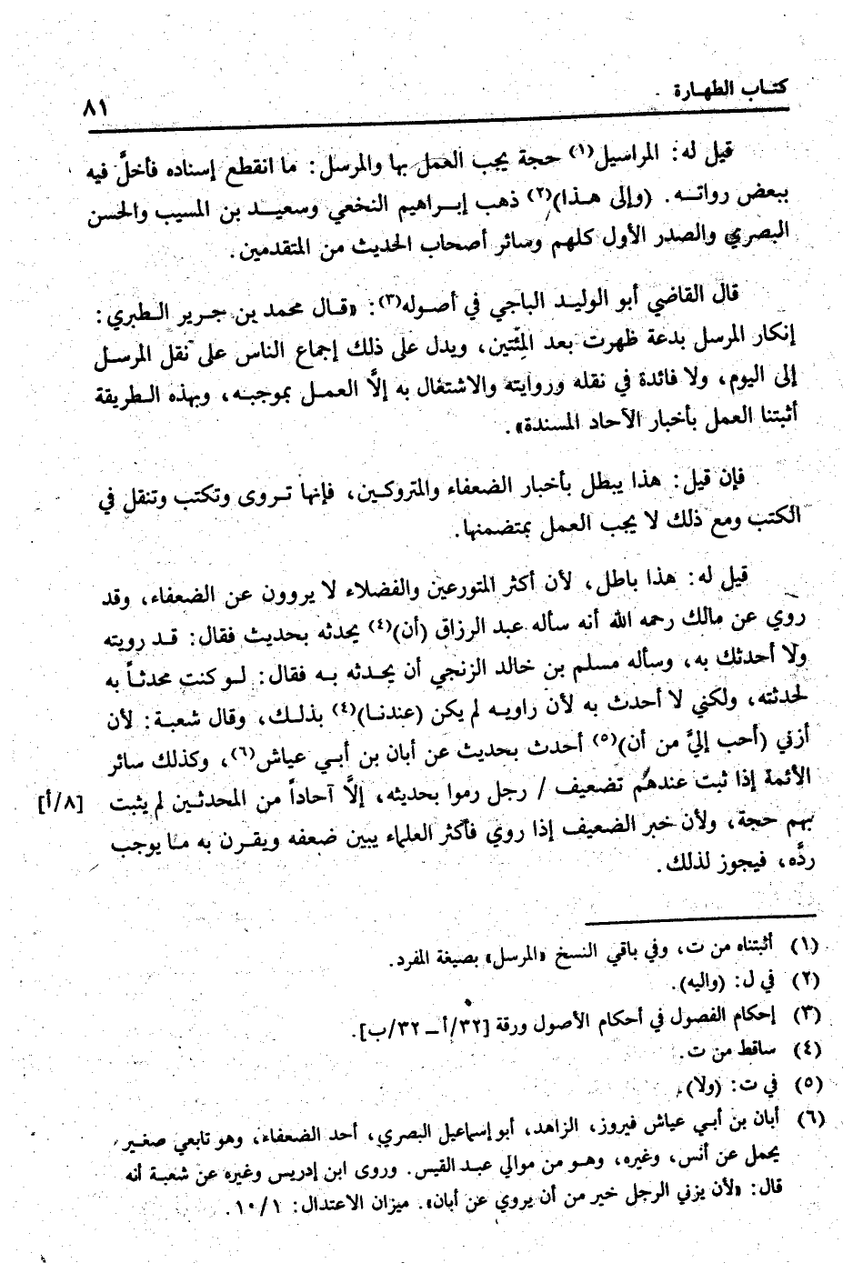 قَالَ القَاضِي أَبُو الْوَلِيد الْبَاجِيّ فِي أُصُوله: " قَالَ مُحَمَّد بن جرير الطَّبَرِيّ: إِنْكَار الْمُرْسل بِدعَة ظَهرت بعد المئتين، وَيدل على ذَلِك إِجْمَاع النَّاس على نقل الْمُرْسل إِلَى الْيَوْم، وَلَا فَائِدَة فِي نَقله وَرِوَايَته والاشتغال بِهِ إِلَّا الْعَمَل بِمُوجبِه، وبهذه الطَّرِيقَة أثبتنا الْعَمَل بأخبار الْآحَاد المسندة ".
