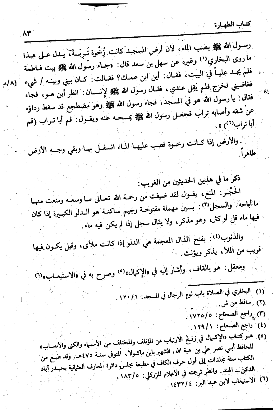 رَسُول الله [صلى الله عَلَيْهِ وَسلم] بصب المَاء، لِأَن أَرض الْمَسْجِد كَانَت رخوة تربة، يدل على هَذَا مَا روى البُخَارِيّ وَغَيره عَن سهل بن سعد قَالَ: " جَاءَ رَسُول الله [صلى الله عَلَيْهِ وَسلم] بَيت فَاطِمَة فَلم يجد عليا فِي الْبَيْت، فَقَالَ: أَيْن ابْن عمك؟ فَقَالَت: كَانَ بيني وَبَينه / شَيْء فغاضبني فَخرج فَلم يقل عِنْدِي، فَقَالَ رَسُول الله [صلى الله عَلَيْهِ وَسلم] لإِنْسَان: انْظُر أَيْن هُوَ، فجَاء فَقَالَ: يَا رَسُول الله هُوَ فِي الْمَسْجِد، فجَاء رَسُول الله [صلى الله عَلَيْهِ وَسلم] وَهُوَ مُضْطَجع قد سقط رِدَاؤُهُ عَن شقَّه وأصابه تُرَاب فَجعل رَسُول الله [صلى الله عَلَيْهِ وَسلم] يمسحه عَنهُ وَيَقُول: قُم أَبَا تُرَاب (قُم أَبَا تُرَاب) ".