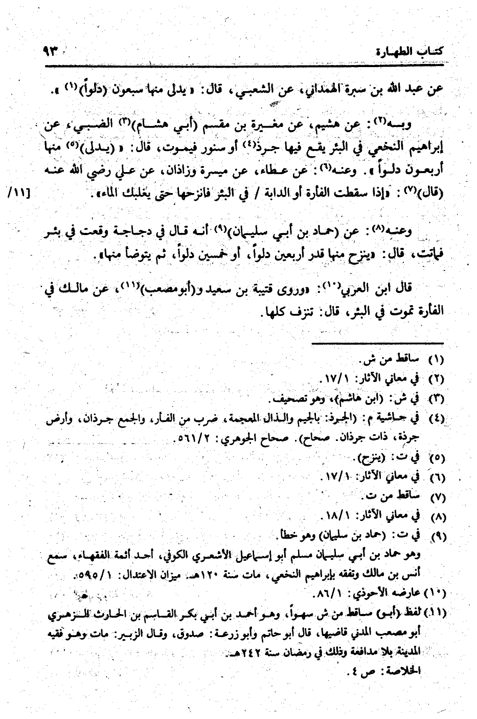 وَبِه: عَن هشيم، عَن مُغيرَة بن مقسم (أبي هِشَام) الضَّبِّيّ، عَن إِبْرَاهِيم النَّخعِيّ فِي الْبِئْر يَقع فِيهَا جرذ أَو سنور فَيَمُوت، قَالَ: " (يدلى) مِنْهَا أَرْبَعُونَ دلوا ". وَعنهُ: عَن عَطاء، عَن ميسرَة وزاذان، عَن عَليّ رَضِي الله عَنهُ (قَالَ) : " إِذا سَقَطت الْفَأْرَة أَو الدَّابَّة / فِي الْبِئْر فانزحها حَتَّى يَغْلِبك المَاء ".